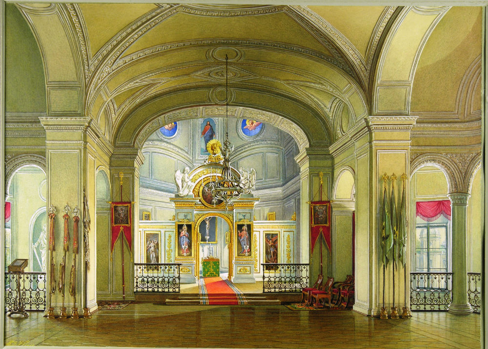 За галереями находилась Овальная комната. Ее стены украшали картины С. Ф. Щедрина с видами Гатчинского парка, которыми закрыли во второй половине XIX века росписи Д. Б. Скотти. Из Овальной комнаты по небольшому коридору можно было пройти в дворцовую церковь Св. Троицы (ил. 10). Церковь была устроена в башне Кухонного каре еще при Г. Г. Орлове, но перестраивалась несколько раз. На акварели Э. П. Гау церковь изображена после перестройки 1840-х годов, осуществленной по проекту архитектора Р. И. Кузьмина. Скульптор П. Дылев создал лепной декор этого интерьера, росписи стен и светового фонаря выполнили художники П. М. Шамшин и А. Ф. Перниц.
