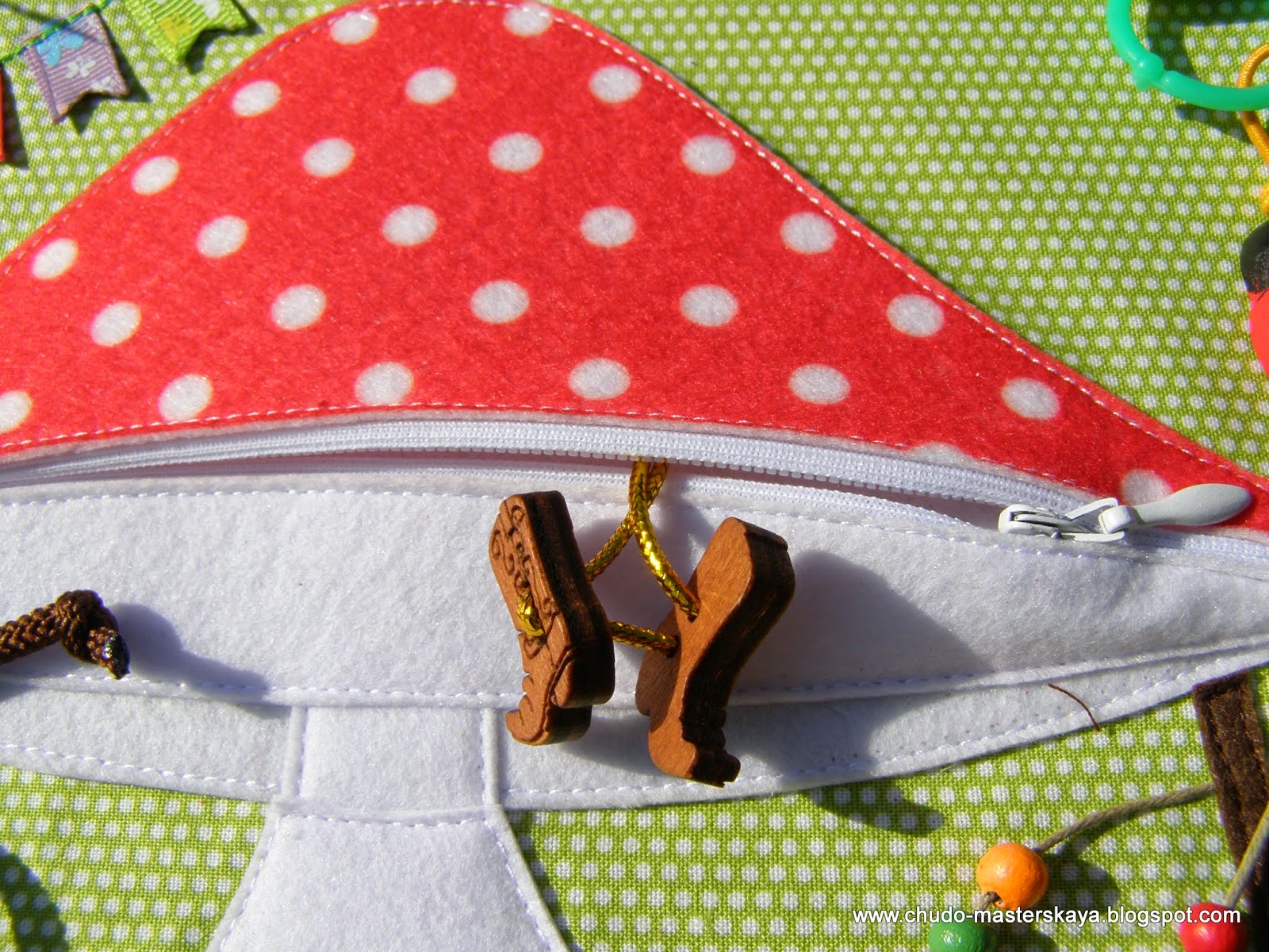 Домик, в виде грибочка, из жесткого корейского фетра, закрывается на воздушную петельку и пуговку-цветочек.