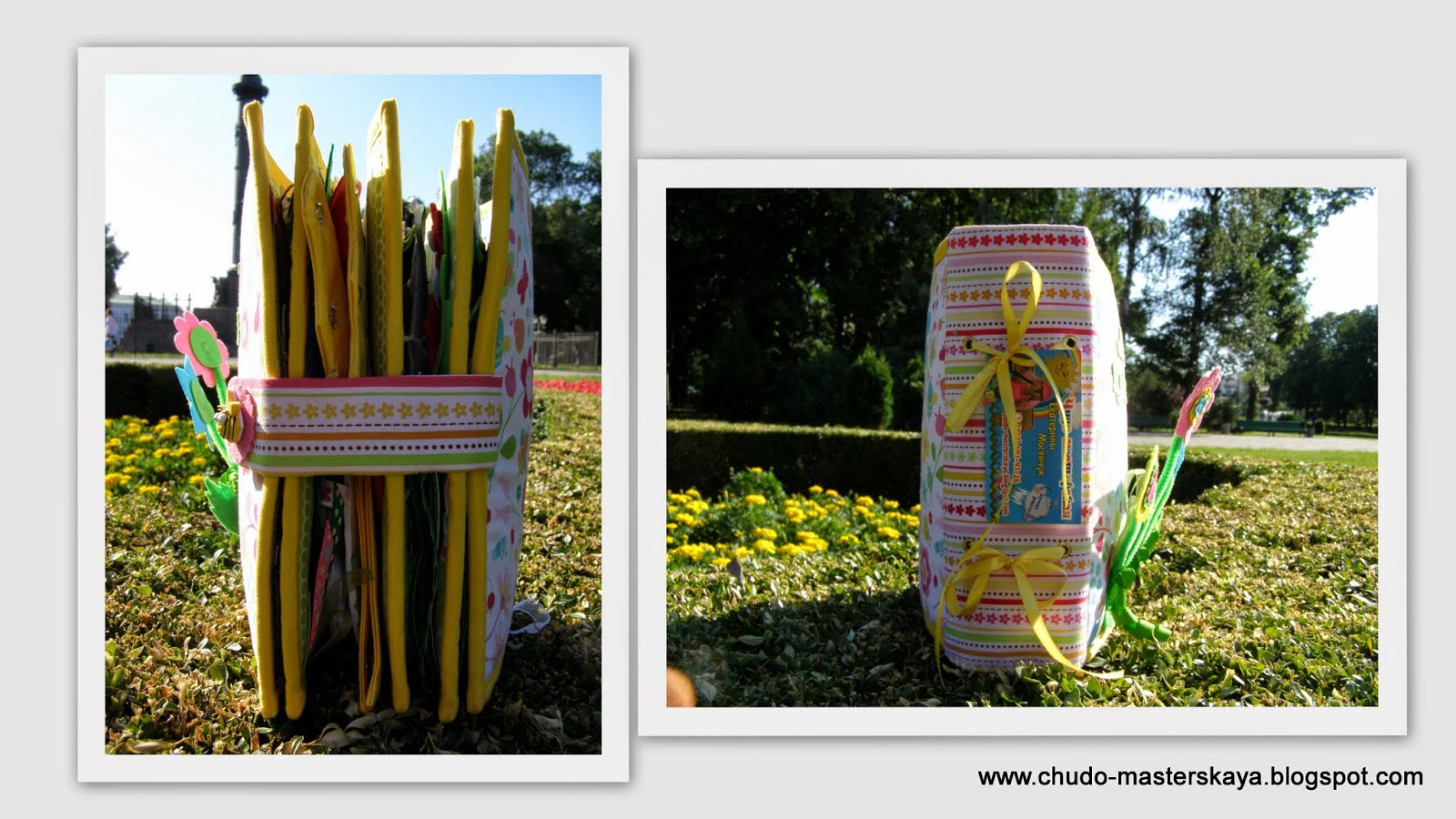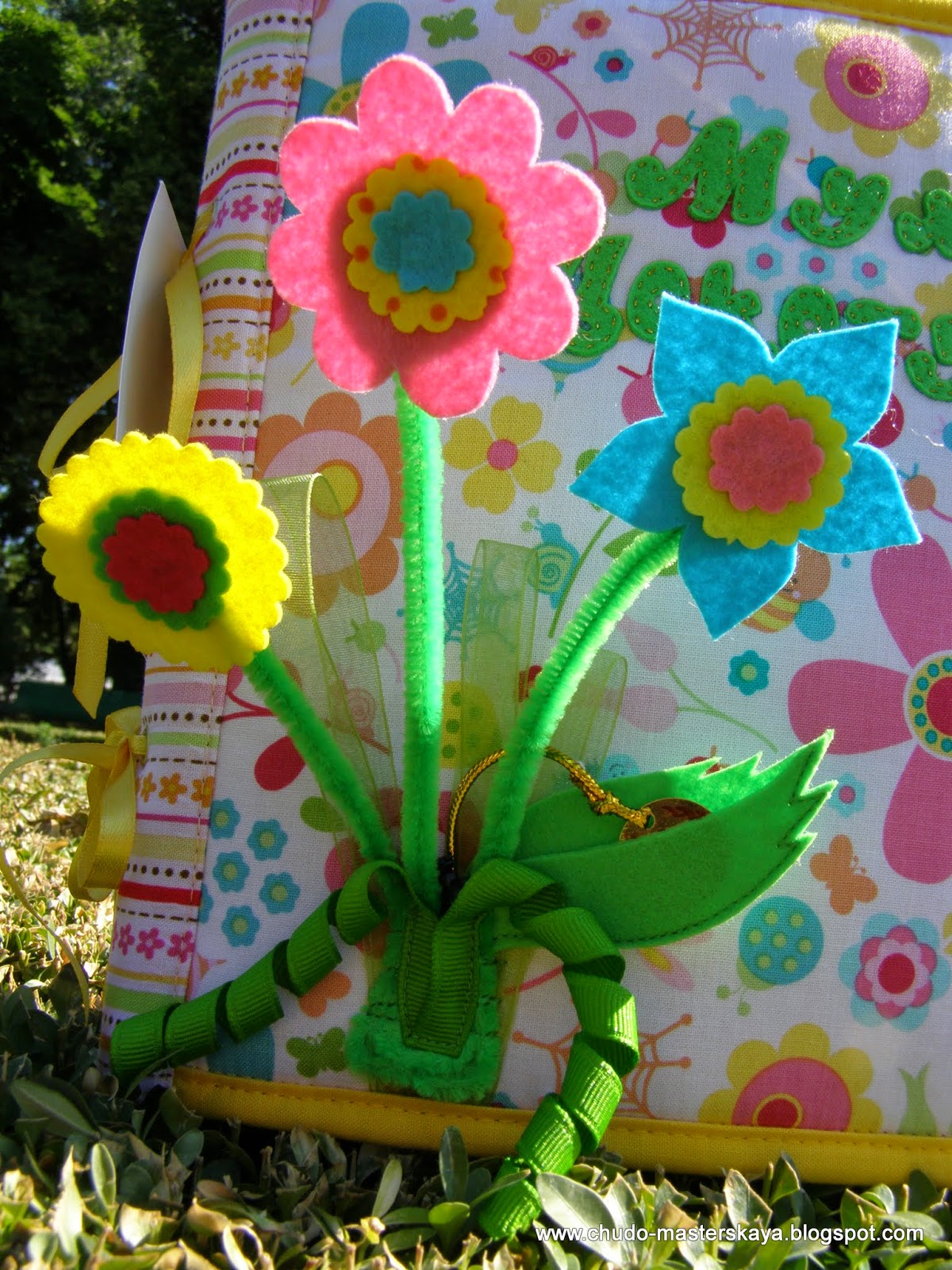 На обложке "растут" нежные цветы. Я специально изобразила их так, отдельностоящими, потому что на этом фоне прием с аппликацией был бы слишком ляпистый. Стебли из синельной проволоки, травка из органзы и "кудрявой" репсовой ленты. В стеблях прячется маленький муравей-пуговка, а в листике - денюжка.