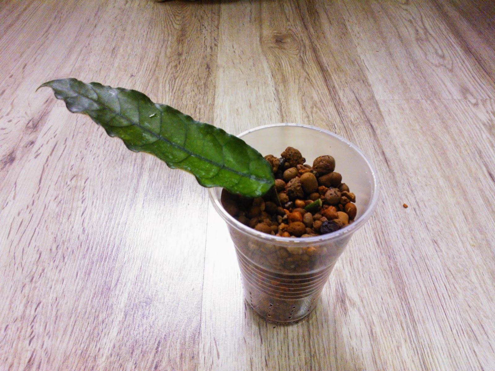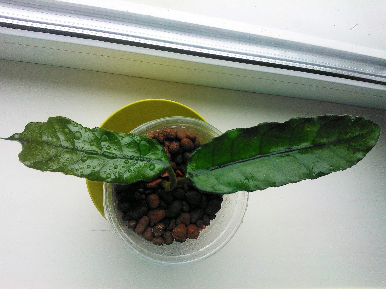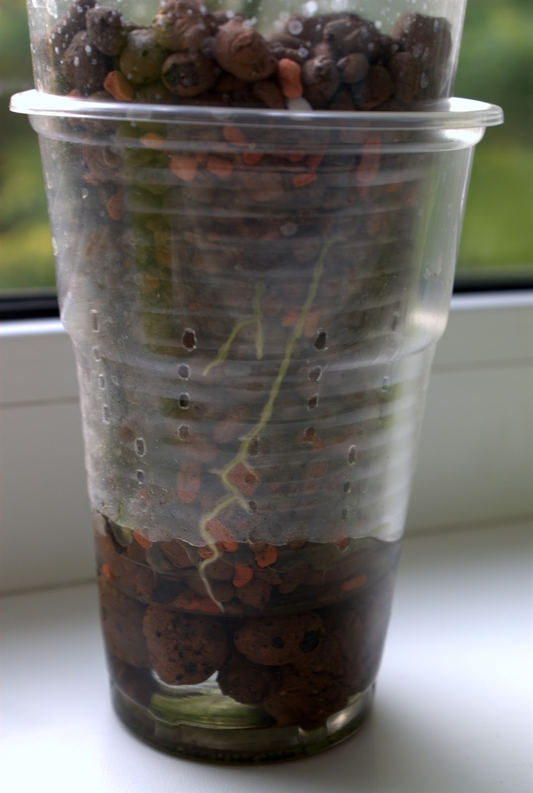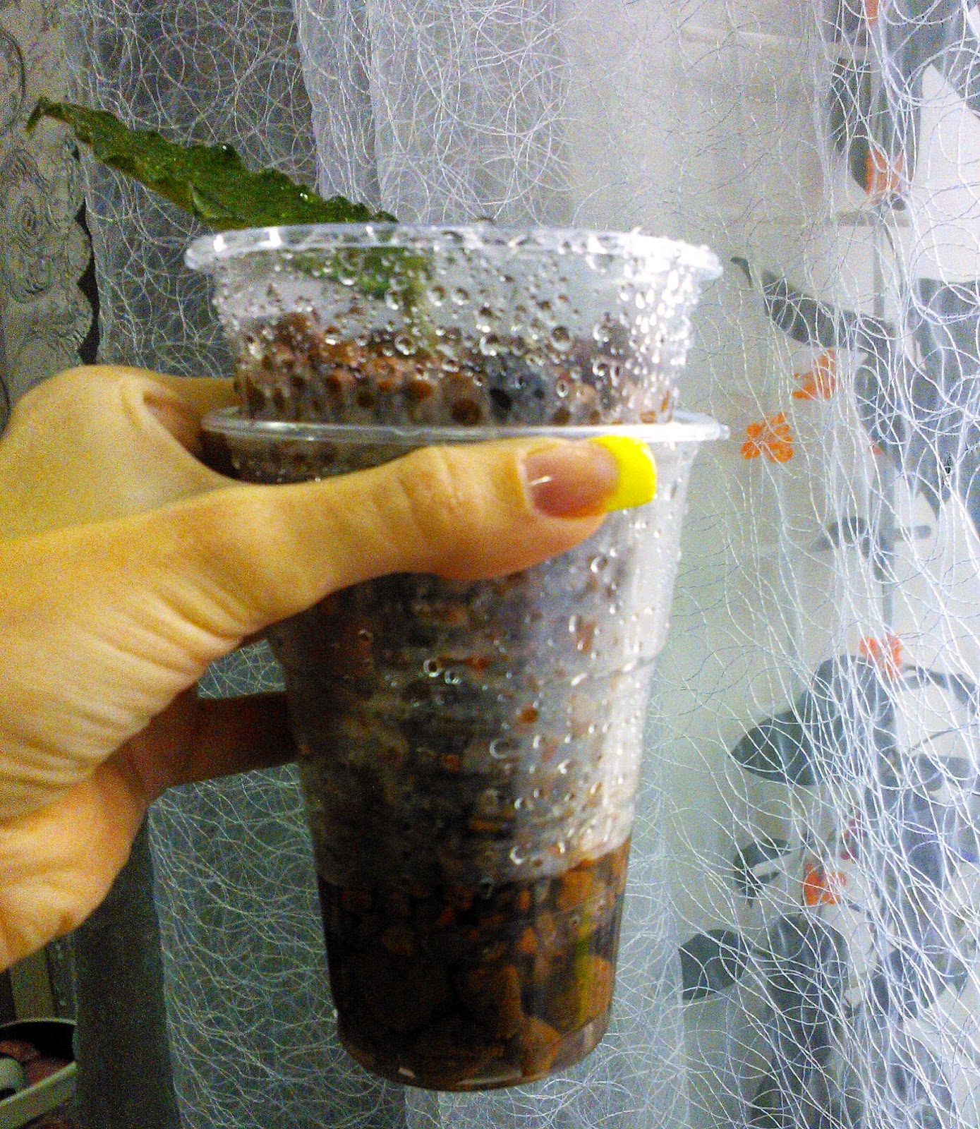 Нижний стакан, по уровню керамзита, наполняем водой. И внутрь (сверху на керамзит) ставим внутренний (с черенком). Получается вот такая конструкция. После этого хойя отправляется на окно и на две недели о ней можно забыть. Я, конечно, не отлипаю от окна, щупаю лист, на предмет потери тургора (что бы не было слишком поздно))). И, конечно, хочется её дико любить, самозабвенно ухаживать и заботиться, но я бью себя по рукам и сдерживаюсь из последних сил. Лишний фанатизм в этом деле, как показывает практика, неизбежно ведёт к смерти предмета сей неконтролируемой страсти .)))