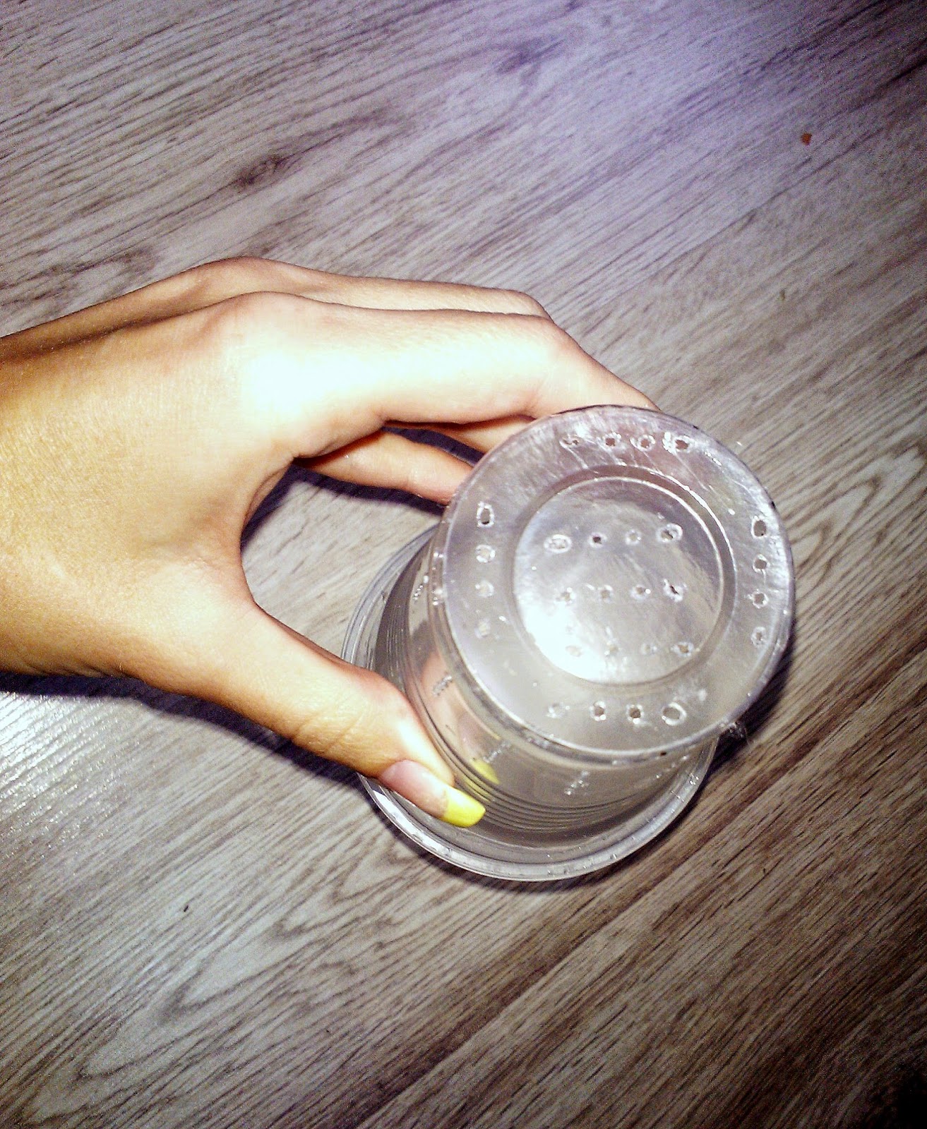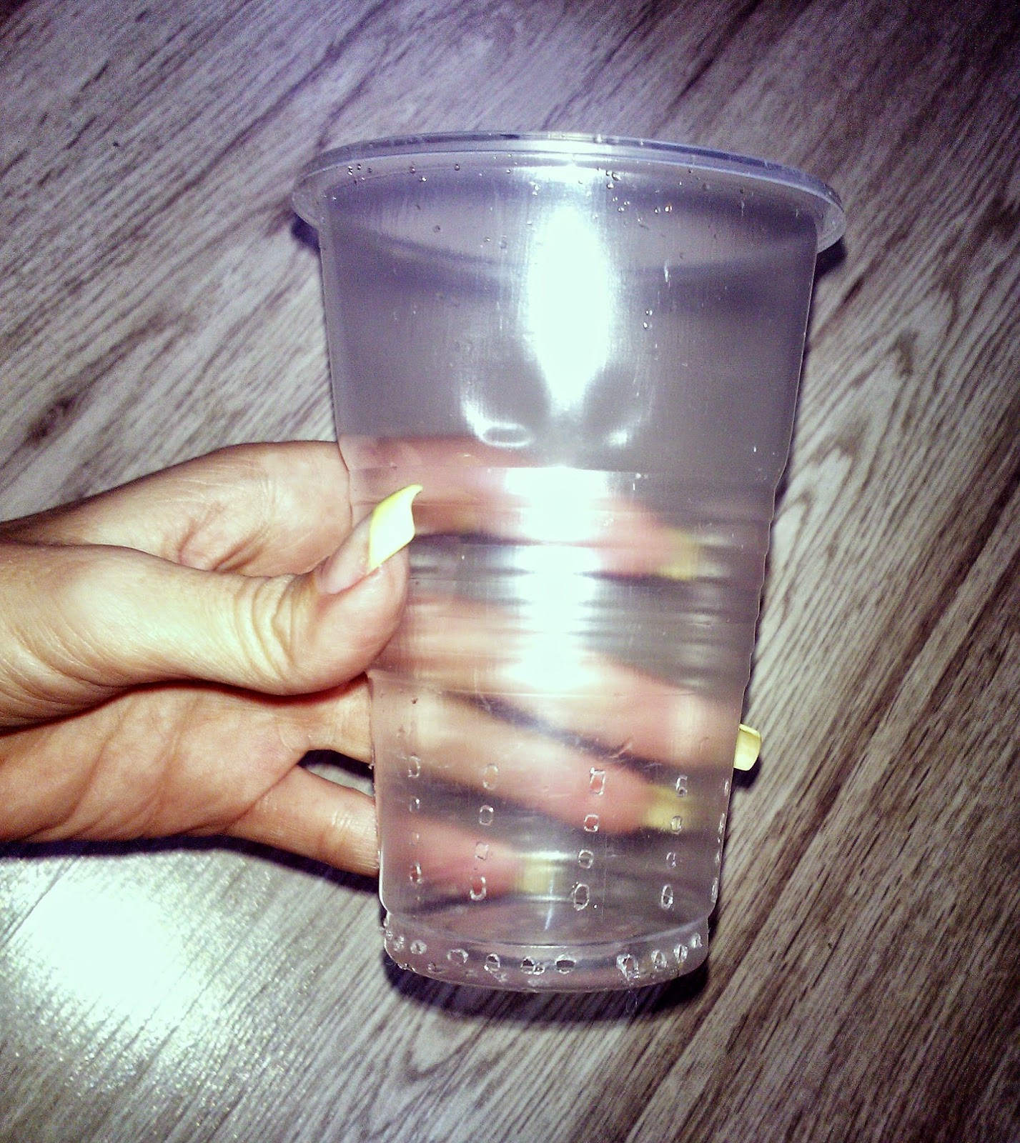 И раз дошло дело до посадки, как и обещала, пошагово покажу, как это у меня происходит.) Итак! Пластиковый стакан, 500 мл. подвергается нещадному дырявлению.))) В моём случае, и на этот раз, это произошло с помощью вилки, разогретой над огнём плиты. На фото видно до какого уровня я делаю отверстия. Для лучшей аэрации. Этот стакан будет внутренним (тем, в который будет посажена хойя ).