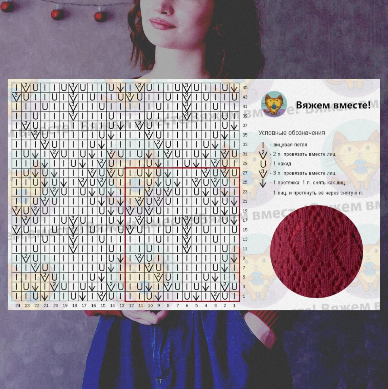 Кардиган выполнен интересным и не самым простым в исполнении ажурным узором, который включает в себя листья и ажурные ромбы. Раппорт узора составляет 12 петель по ширине и 28 рядов по высоте полотна. На схеме даны только лицевые ряды вязания, изнаночные вяжутся по рисунку петель на спице.