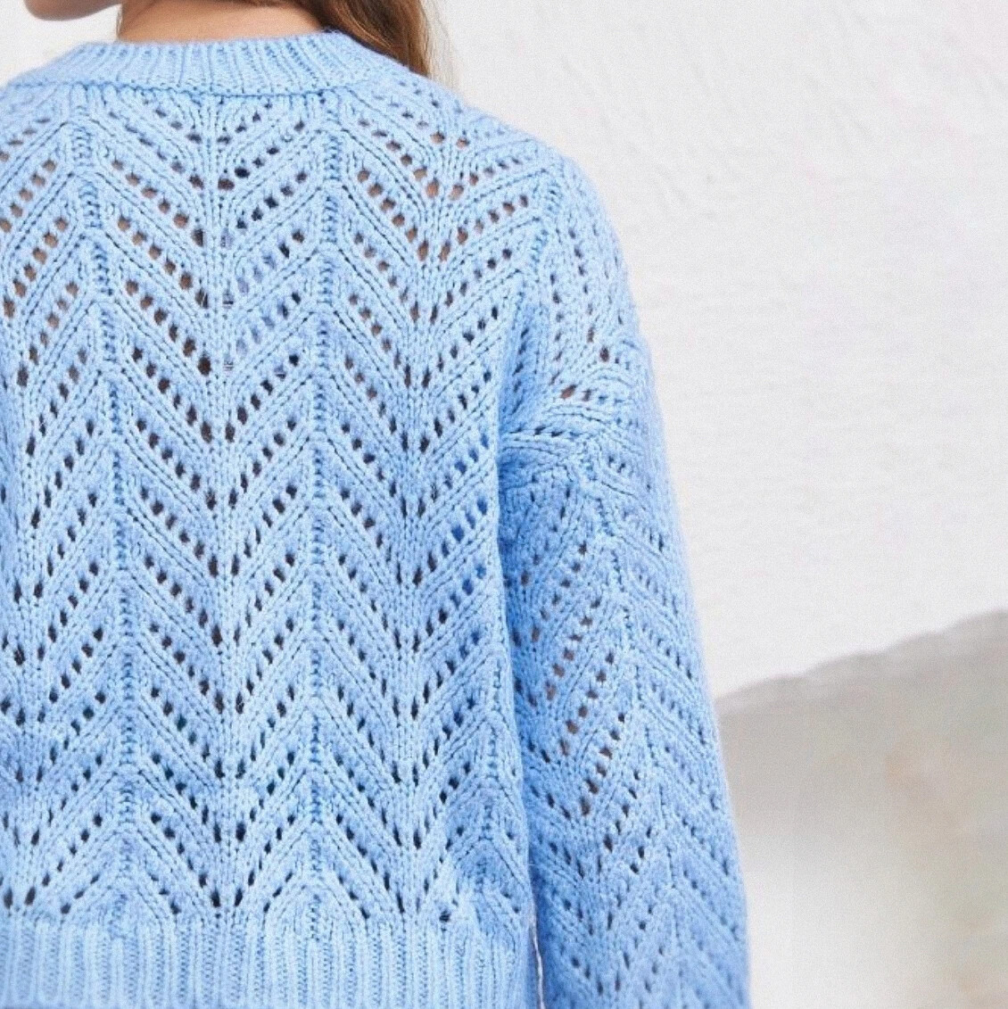 Ажурные узоры в любом изделии смотрятся выигрышно, особенно если рисунок имеет чёткие геометрические линии, как в голубом кардигане.