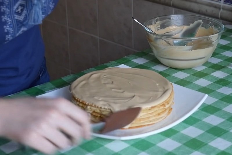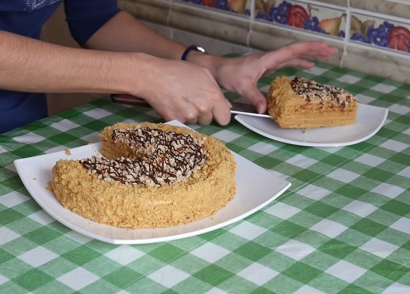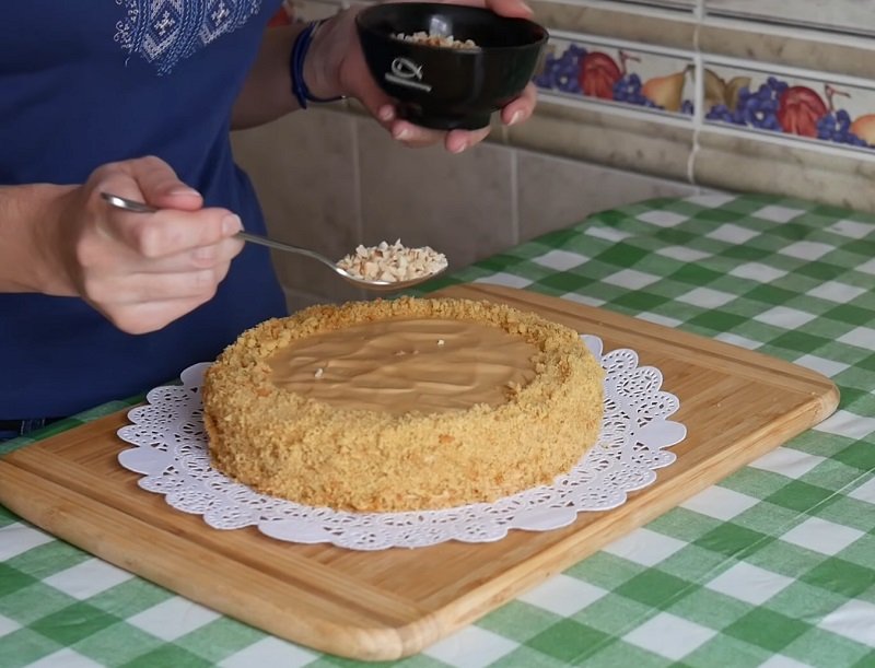 - Соберите торт. Песочный пласт щедро промажьте кремом. Выложите следующий корж, опять смажьте. Собранную стопку покройте кремом со всех сторон.