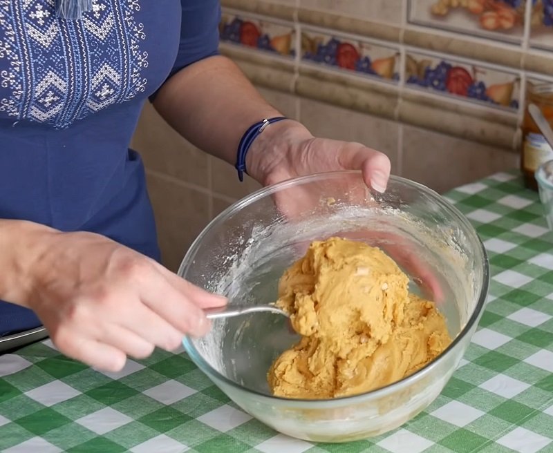 - Далее просейте половину муки с разрыхлителем. Затем добавьте всё к масляно-ореховой массе. Тщательно размешайте.