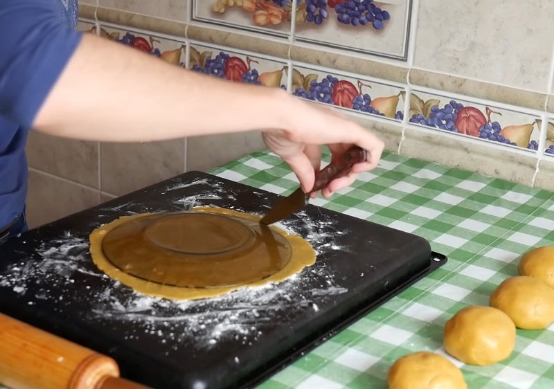 Уберите пленку. Приложите крышку от кастрюли или тарелку диаметром около 20 см. Очертите контур коржа острым ножом.