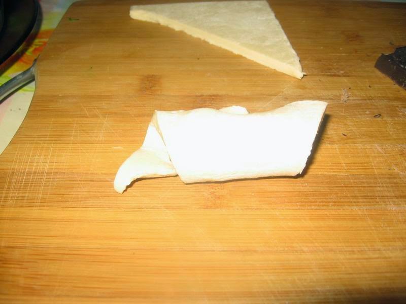 Небольшой ккусочек шоколада положить на уголочек, аккуратно завернуть его так, чтоб шоколадка была внутри.