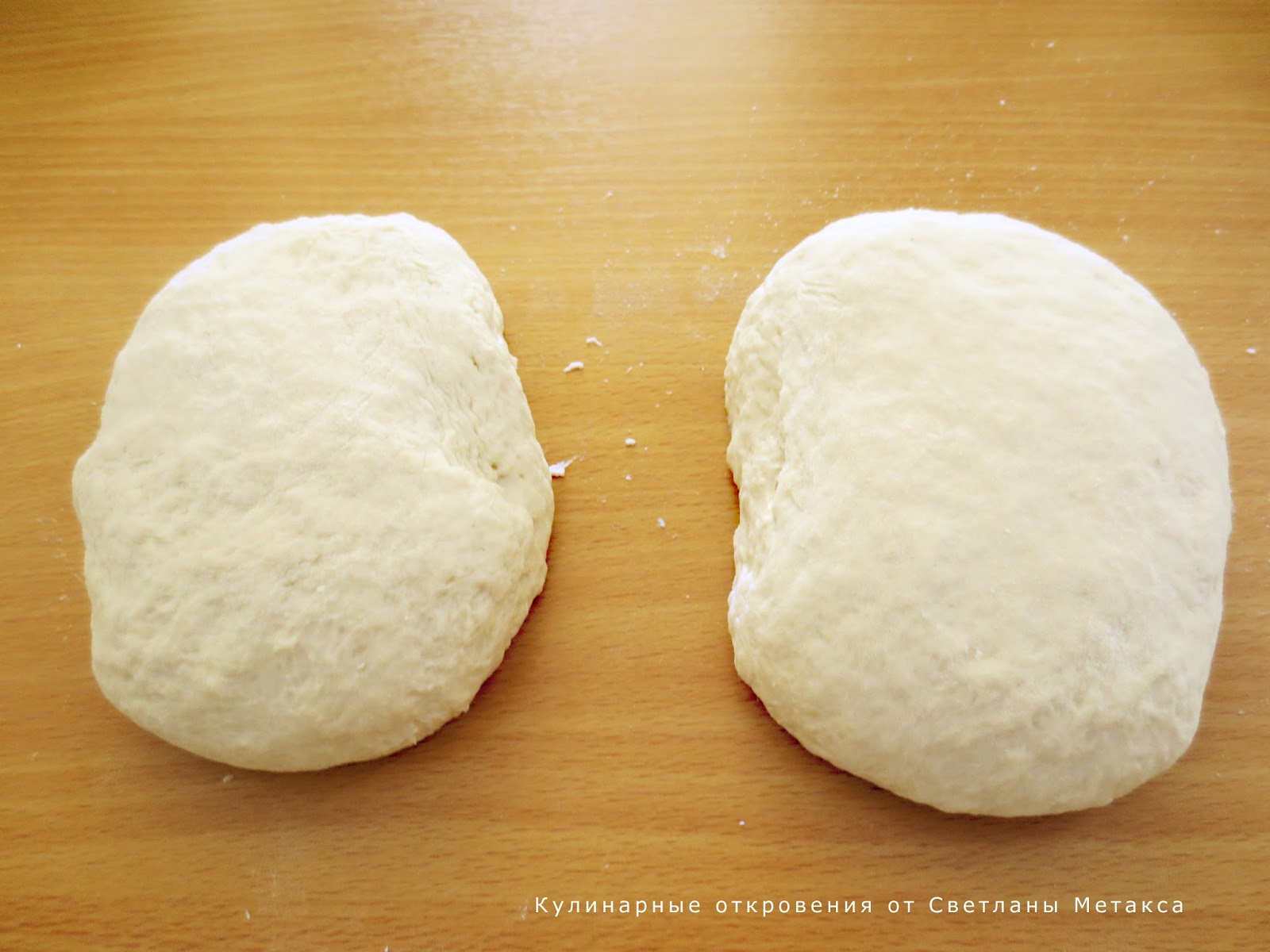 2.Готовое тесто обмять, разделить на 2 одинаковые части, скатать их в шар.