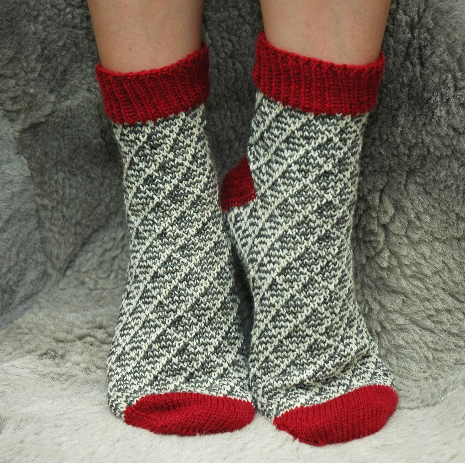 около 50 (60/70 ) г носочной пряжи основного цвета ( ОЦ ) ( на фото синего, у меня серого ); около 40 (50/60 ) г контрастного пряжи цвета ( КЦ ) ( на фото желтого цвета, у меня белого ) + у меня красного цвета; спицы 2,5мм.