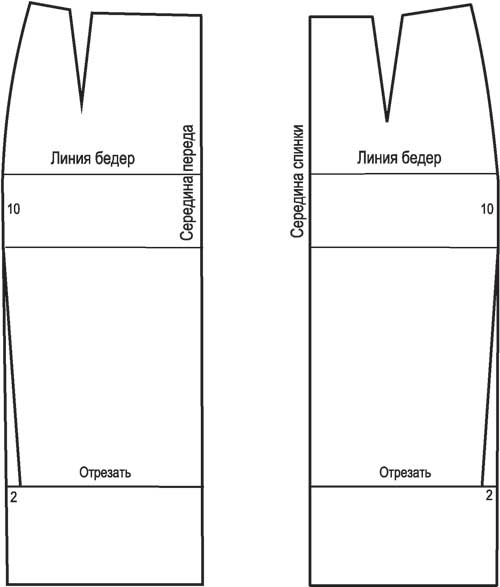 Выкройку передней половинки юбки и спинки юбки укоротить до желаемой длины (длина юбки около 55 см). От линии бедер отложить 10 см вниз и провести горизонтальную линию. По низу юбки от линии бока отложить 2 см. Заузить юбку как показано на чертеже выкройки.