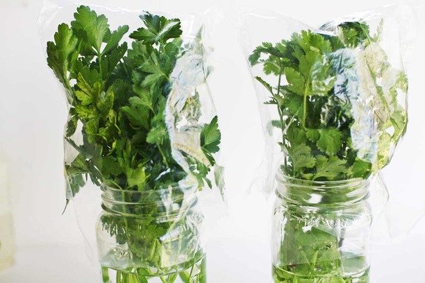 Проверенный и лучший способ хранить свежую зелень — подрезать ее стебли, поместить в стакан с прохладной водой, как букет цветов, накрыть пакетом и поставить в холодильник. Так лучше всего хранить укроп, петрушку, мяту.