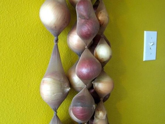Храните репчатый лук в старых колготках, перевязав каждую луковицу отдельно. Так он может храниться около 8 месяцев.