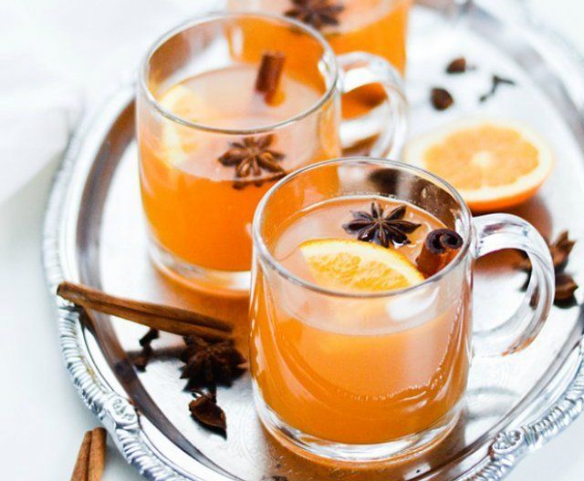Приготовление. Все ингредиенты сложите в кастрюлю и поставьте на средний огонь. Поварите 10 минут, затем снимите с огня и разлейте по стаканам. Украсьте долькой апельсина или яблока и подавайте.