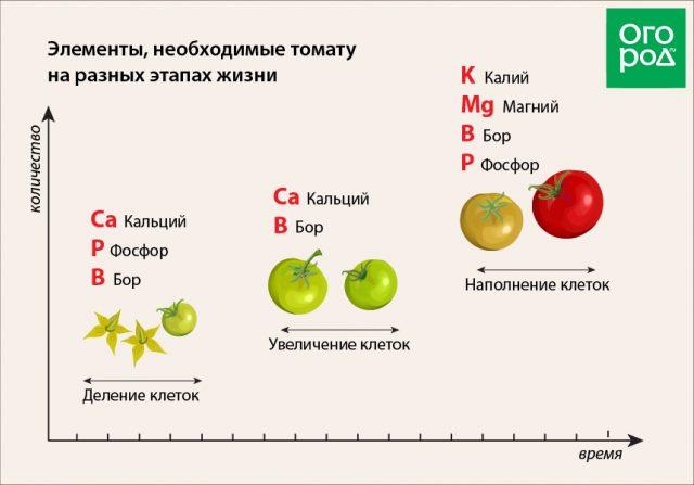 Одним из особо нуждающихся в боре растений является томат. Ниже приведу очень распространенную фотографию, в которой показано, какие микро- и макроэлементы необходимы томату на разных этапах развития. И обратите внимание, что бор - один из основных элементов питания томата, причем на всех стадиях: от стадии рассады до стадии плодоношения.