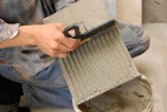 Проделывание борозд зубчатым шпателем на клее нанесеном на плитку