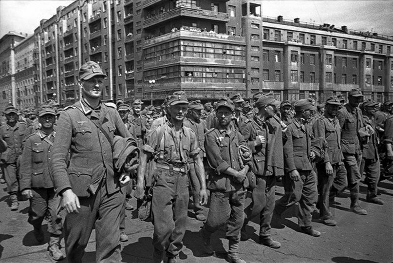 Утром пленные были в 3-ий раз осмотрены врачами. И построены согласно воинским званиям – впереди шли генералы, за ними – полковники, подполковники и т.д. Высшие офицеры были в нормальной чистой форме, у кого были – с наградами. Никто не велел их снять. Рядовые – кто в чем. Огородные пугала выглядели намного лучше. Колонна начала двигаться в 11ч по маршруту – ипподром-Ленинградское шоссе-Триумфальная площадь, где колонна разделилась. Одна часть в 42 тыс.человек направились в сторону Курского вокзала, другая 15 тыс. – в сторону ж/д. станции «Канатчиково». В шествии принимала участие и колонна французских военнопленных. Командовал «парадом» генерал-полковник П.Артемьев. Любопытствующие, большая их часть, встретили колонны гробовым молчанием, от которого становилось не по себе. Были отдельные выкрики. Пытались забросать камнями. Но все это резко пресекалось солдатами охраны и мужчинами в штатском. Следом за колоннами двигались коммунальные «поливалки». Это, наверное, был символический жест: очистим Москву от фашистской нечисти. Это было здорово придумано – понравилось и запомнилось москвичам. К 7 вечера генералов отправили в Бутырскую тюрьму, всех остальных погрузили в эшелоны и отправили на восток – в лагеря.