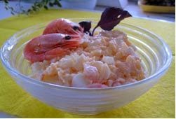Ингредиенты: Упаковка креветок - 120 гр. Яйца - 3 шт. Сыр твердый - 1/4 стакана Долька чеснока Майонез Способ приготовления: Отварить креветки 1-2 минуты в подсоленной воде. Очистить от панциря и мелко нарезать. Сварить яйца и нарезать кубиками. Сыр твердый натереть на крупной терке. Выжать через чесночницу дольку чеснока. Все ингредиенты перемешать и заправить майонезом.