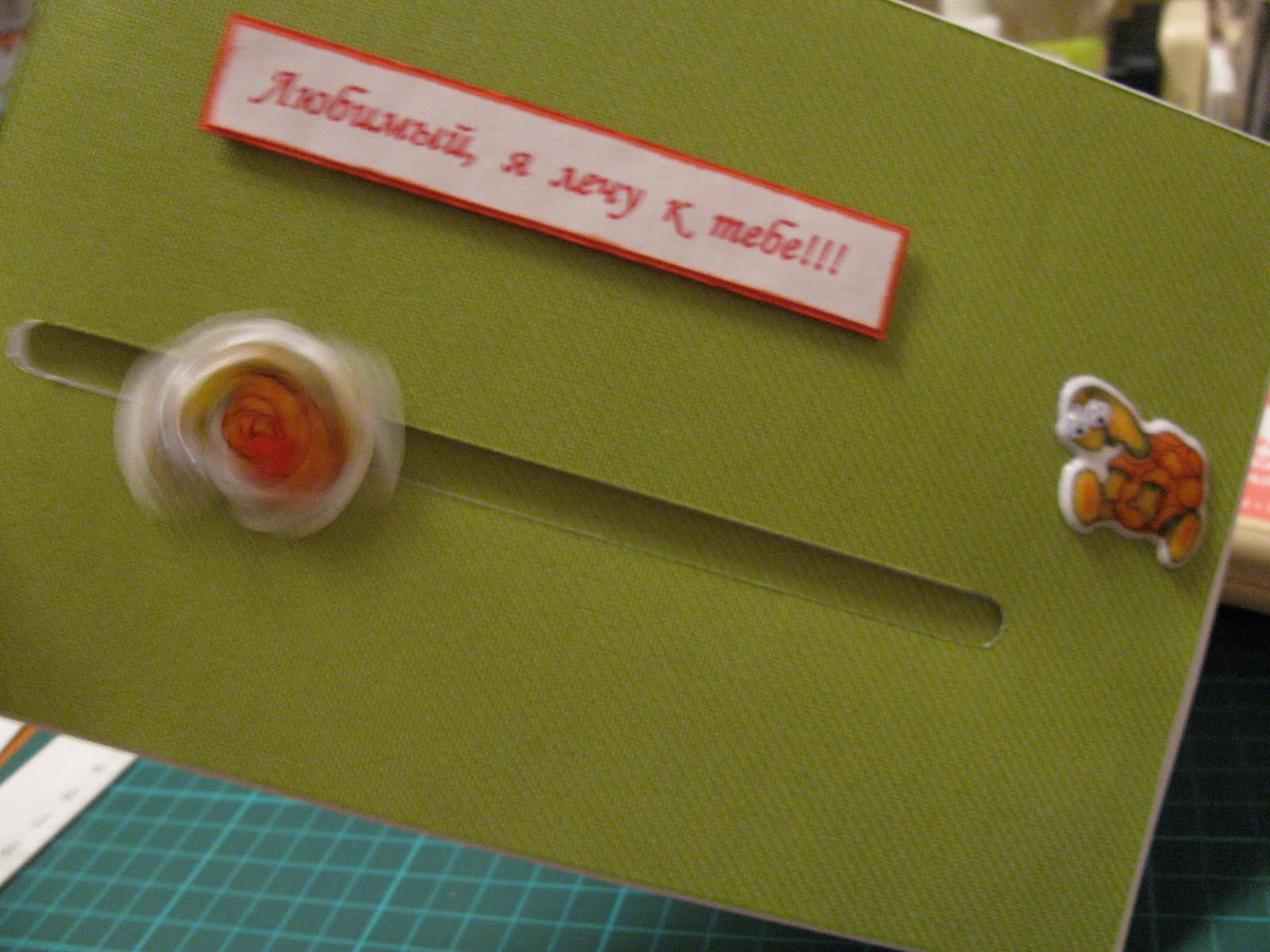 [показать] На втором листе прорезаем при помощи канцелярского или макетного ножа прорезь (у меня 8 мм шириной, так как клеевые кружочки 6 мм). Старайтесь делать линии ровными, чтобы вращающийся элемент без помех крутился в этой прорези.