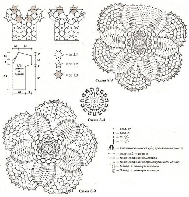 Для выполнения верхней части блузы связать 4 сокращенных мотива по схеме 5.3, прилегающие урезанным лепестком к вырезу горловины переда и спинки; 7 мотивов по схеме 5.2 с пятью лепестками. На схеме развертки показано соединение мотивов между собой по лепестком. Для заполнения промежутков между мотивами внутри полотна вязать мотив по схеме 5.4 и в последнем круговом ряду присоединять его к свободным кроям основных мотивов с помощью зацепа.