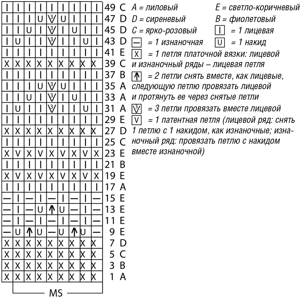 Начать с 1 кромочной, раппорт постоянно повторять, закончить петлей после раппорта и 1 кромочной. Постоянно повторять 1–50-й ряды, при этом соблюдая указания цветов нитей рядом с цифрами рядов.