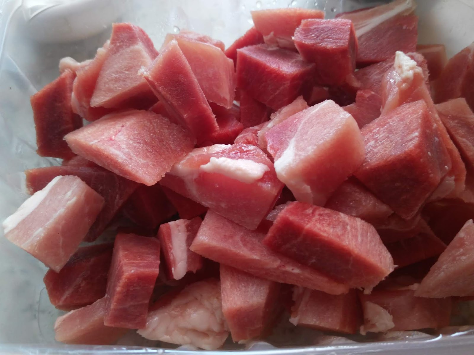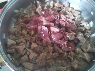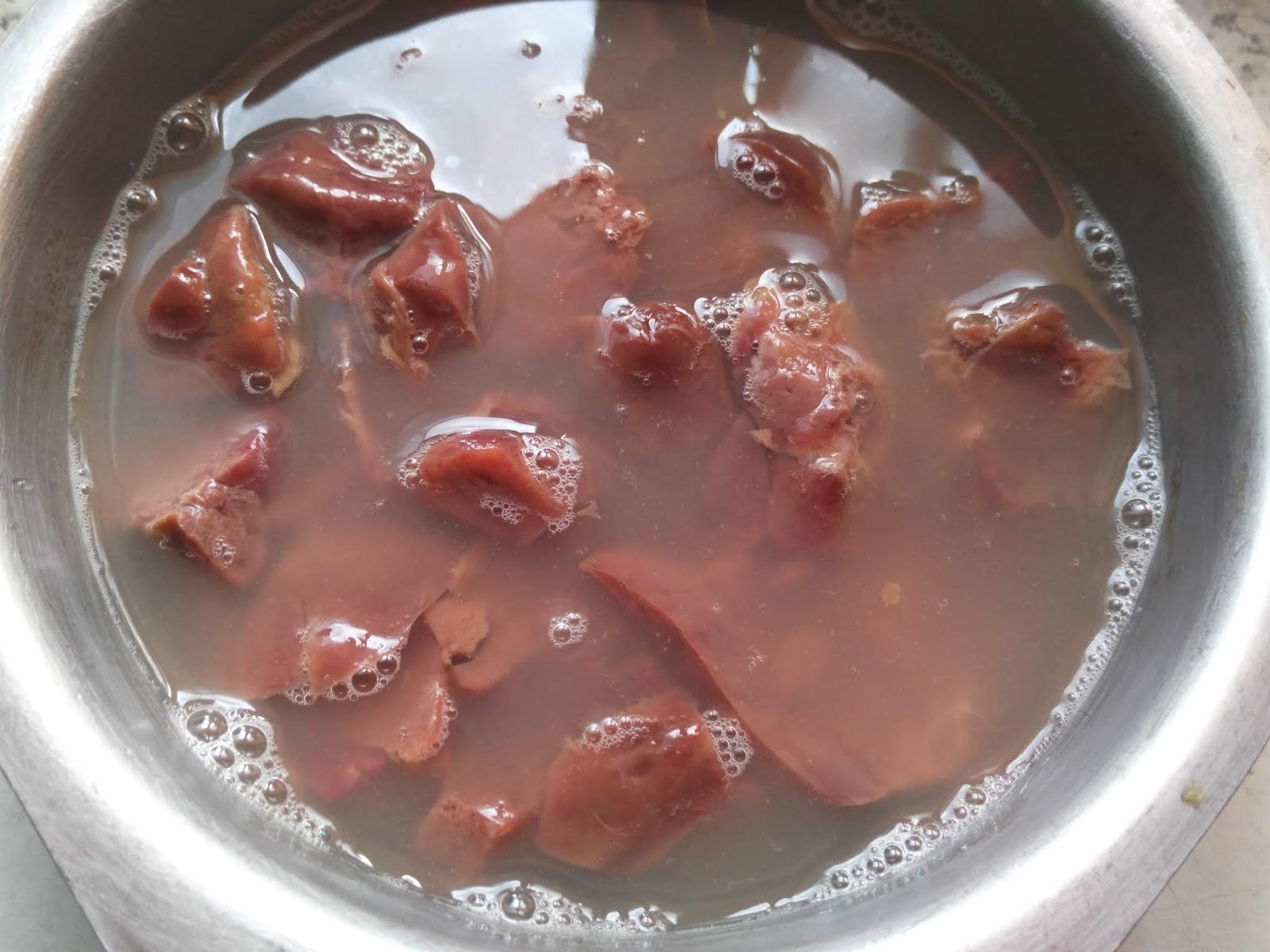 Слейте через минуту и снова повторите операцию -- теперь уже на семь минут -- это поможет нам “запечатать” печеночный сок внутри кусочков. Мясо порежьте кубиками 1,5 на 1,5 см.