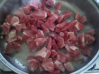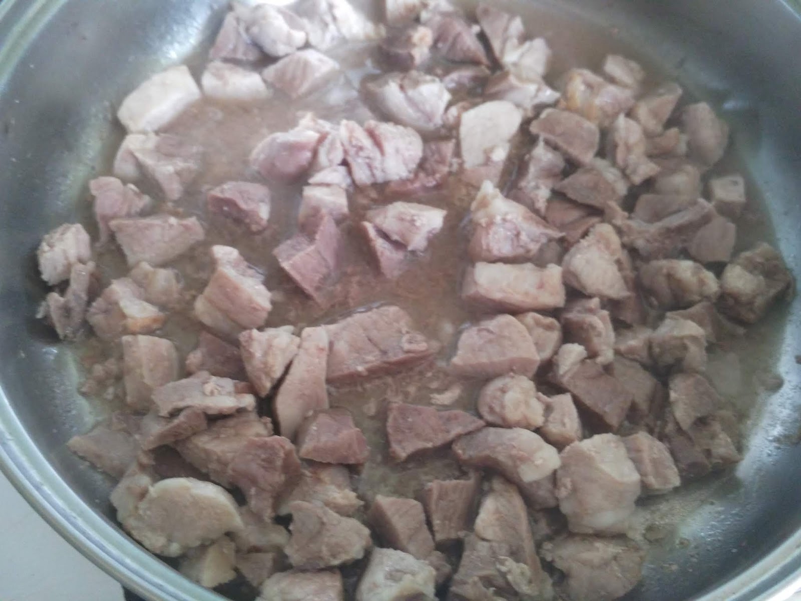 Замечу, что в оригинале рекомендуется порезать мясо размером с два рисовых зернышка -- лично меня на такой подвиг не хватило, но вы можете попробовать повторить. Глубокую сковороду или сотейник разогрейте. Выложите в сковороду все мясо сразу,