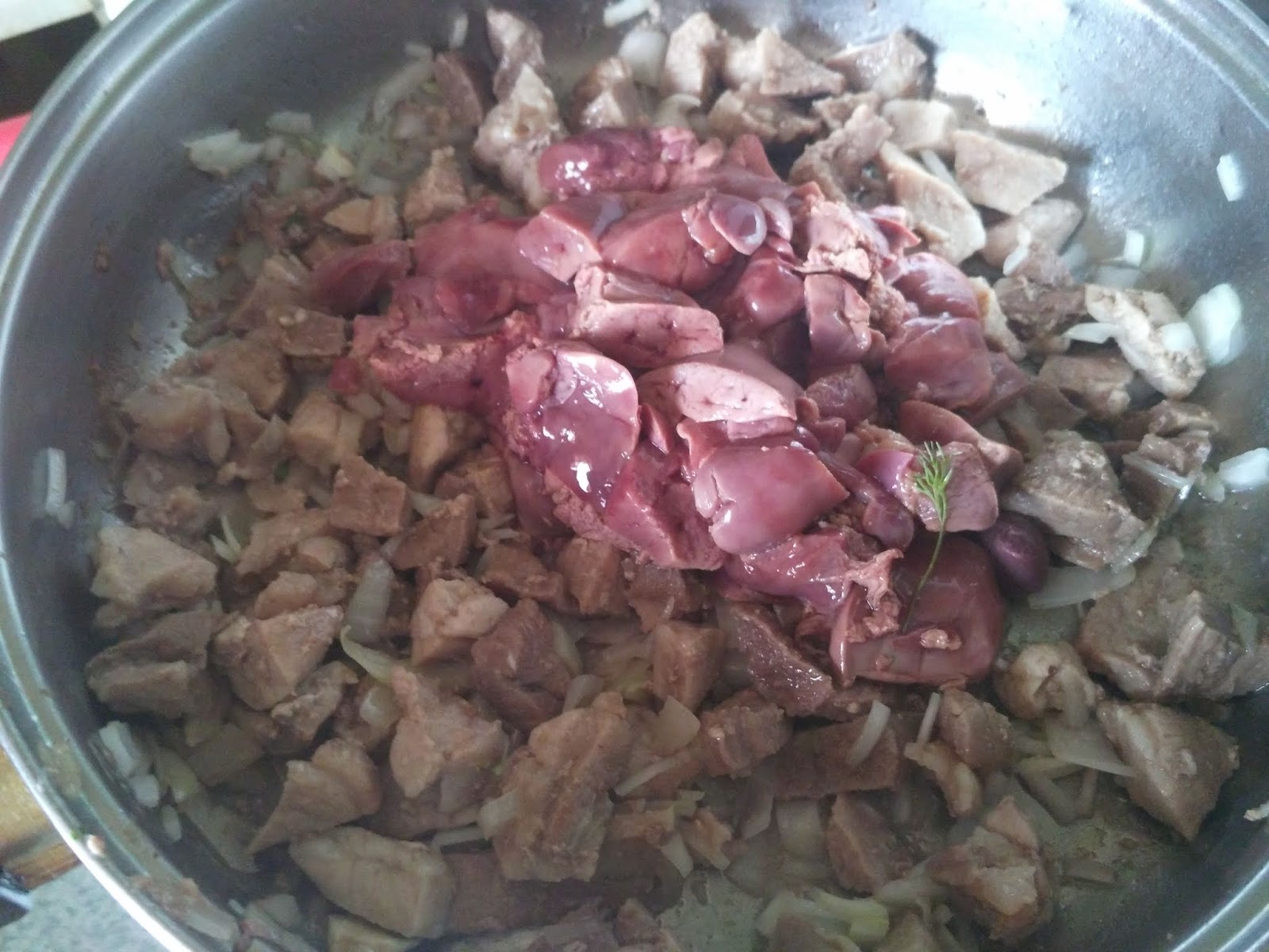 Обжариваем все вместе, помешивая. Следом отправляем в сотейник печенку.