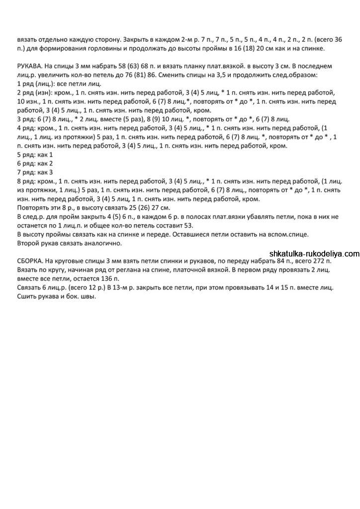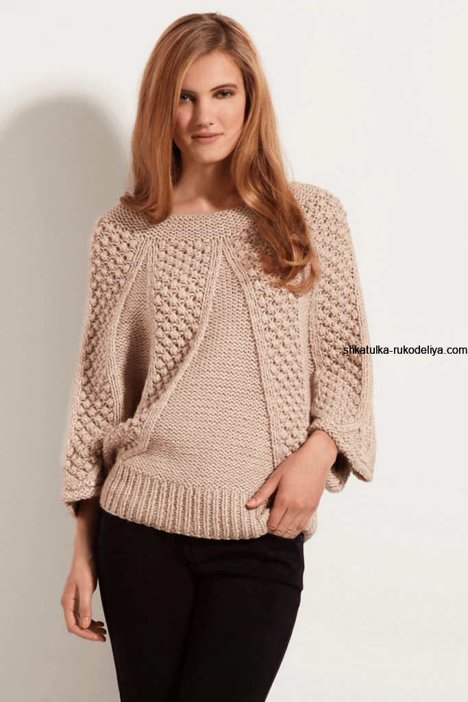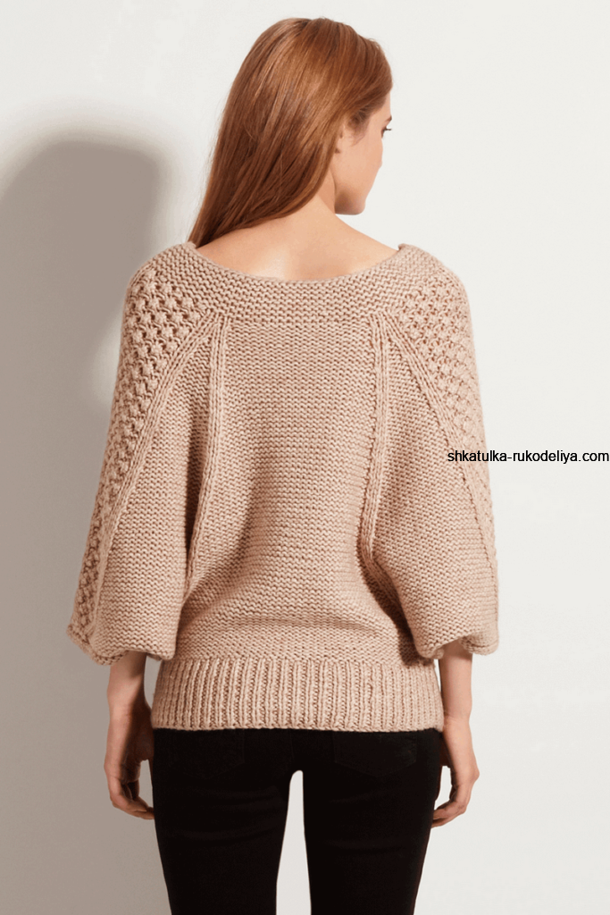 Пуловер женский с рукавом реглан. Рельефные полосы из платочной вязки и узора и сходятся на уровне горловины, формируя кокетку убавлениями в платочной вязке.