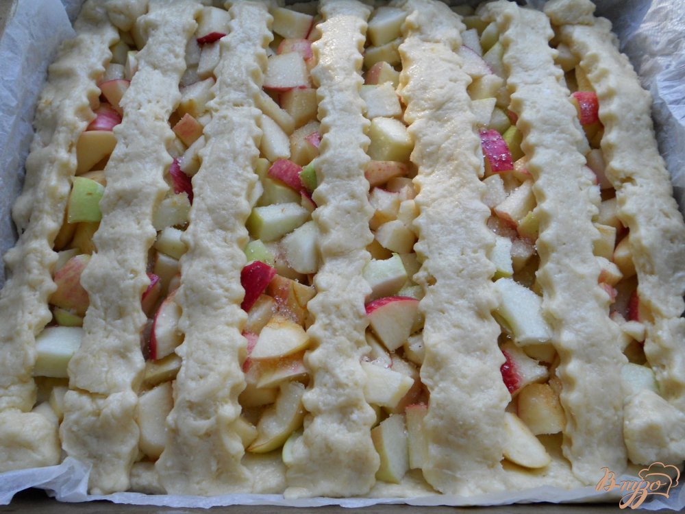 Выкладываем ровным слоем яблоки. Посыпаем сахаром. Из оставшейся части вырезаем полоски и помещаем их на яблоки, немного прижимая по краям.
