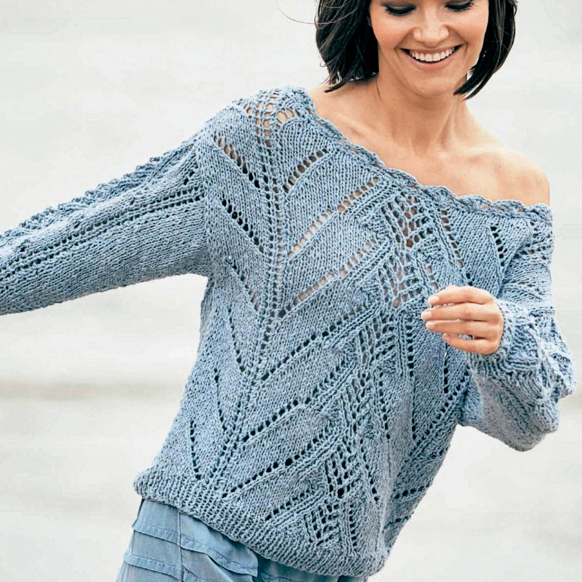 Ажурный серо-голубой пуловер крупной вязки. Симпатичная и несложная модель спицами. Простой фасон со спущенным рукавчиком, широкий вырез лодочкой, кокетливо обнажающий плечико. Кружевная отделка горловины крючком.