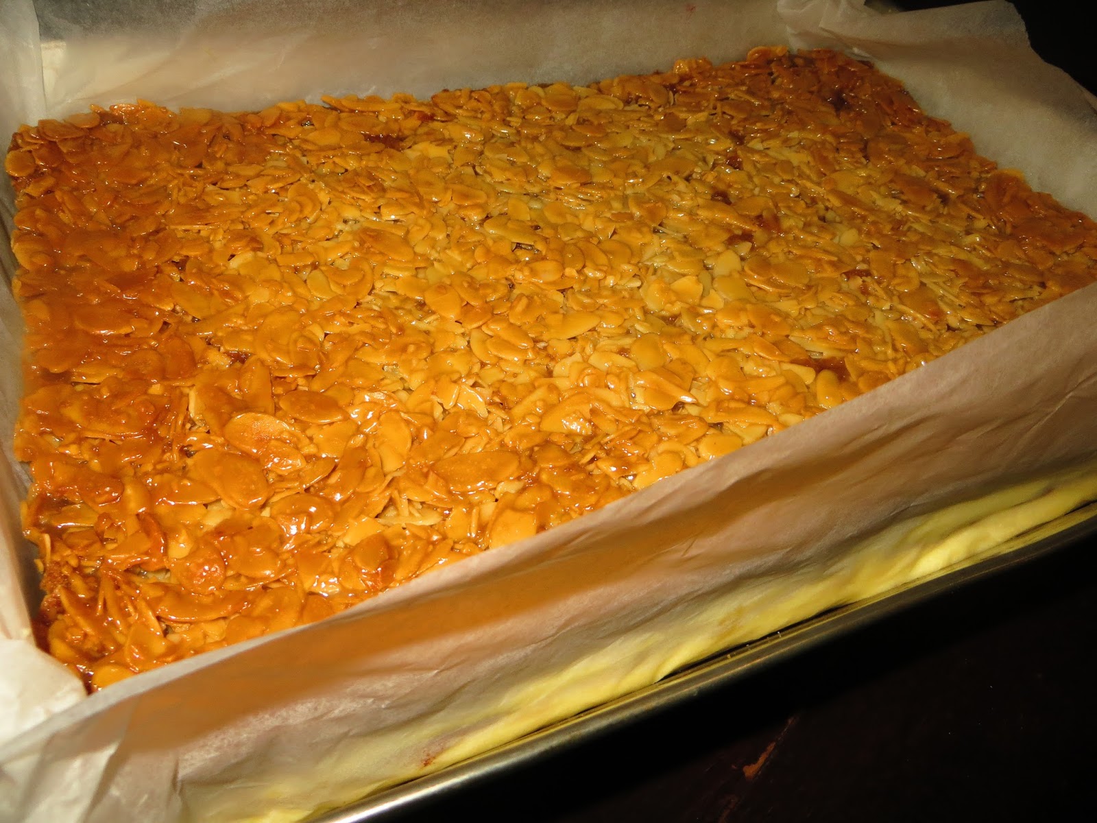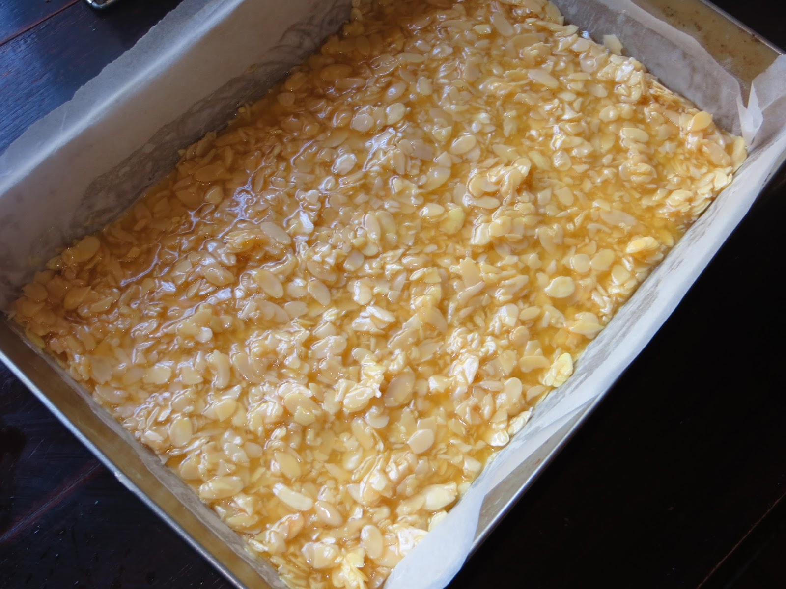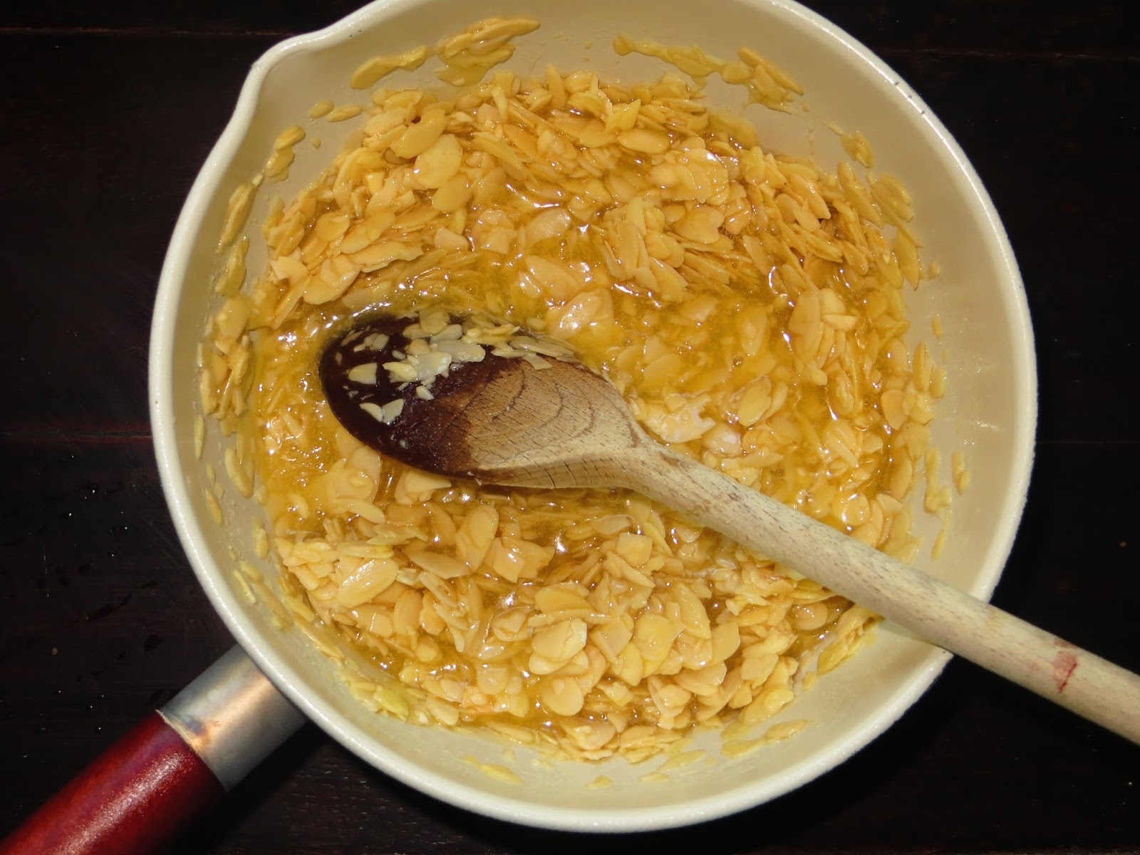 Засыпать хлопья миндаля и тщательно перемешать. Слегка охладить