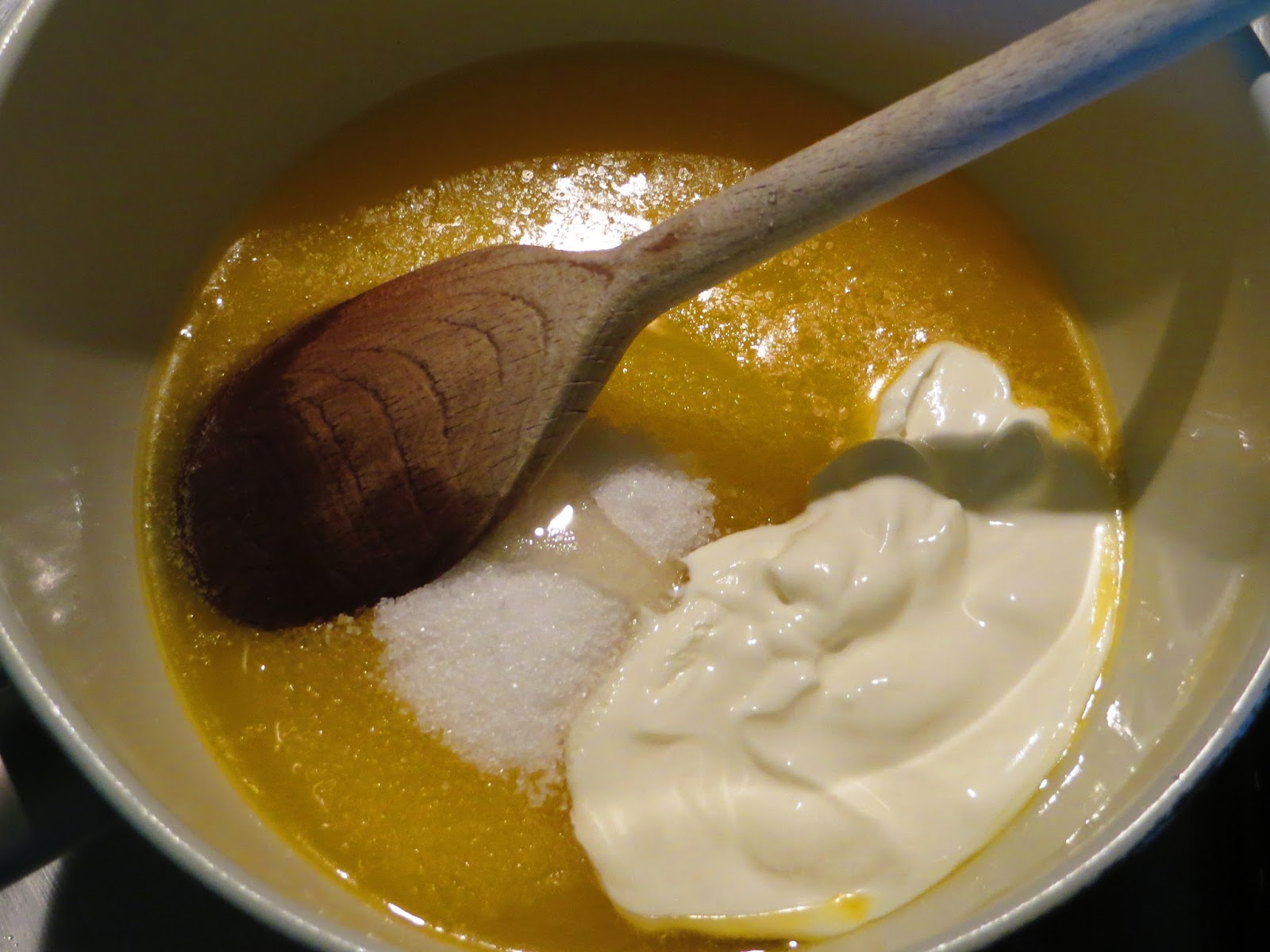 Растопить сливочное масло. Добавить сахар и мед, влить сметану, перемешать.