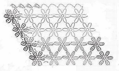 1 ряд: пропустить 5 петель на цепочке, в 6-ю петлю вязать * 1 столбик с накидом, затем 2 воздушные петли, 1 соединительный столбик в ту же петлю (центр цветка), 2 воздушные петли, столбик с накидом в центр цветка, 2 воздушные петли, пропустить 4 петли на цепочке, 1 столбик без накида, 2 воздушные петли, пропустить 4 петли на цепочке *, 1 столбик с накидом, затем 2 воздушные петли, 1 соединительный столбик в ту же петлю (центр цветка), 2 воздушные петли, столбик с накидом в центр цветка, 2 воздушные петли, пропустить 4 петли на цепочке, 1 столбик без накида, 2 воздушные петли, пропустить 2 петли на цепочке, 1 столбик с накидом в последнюю петлю цепочки;