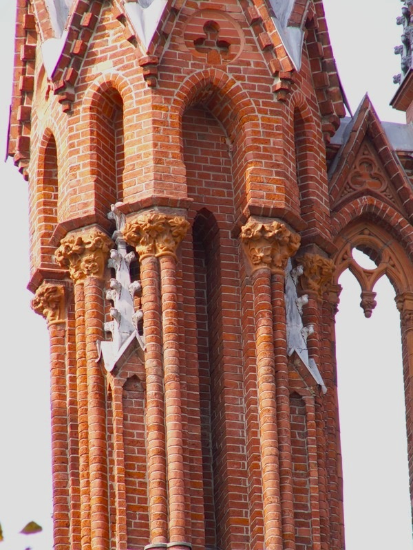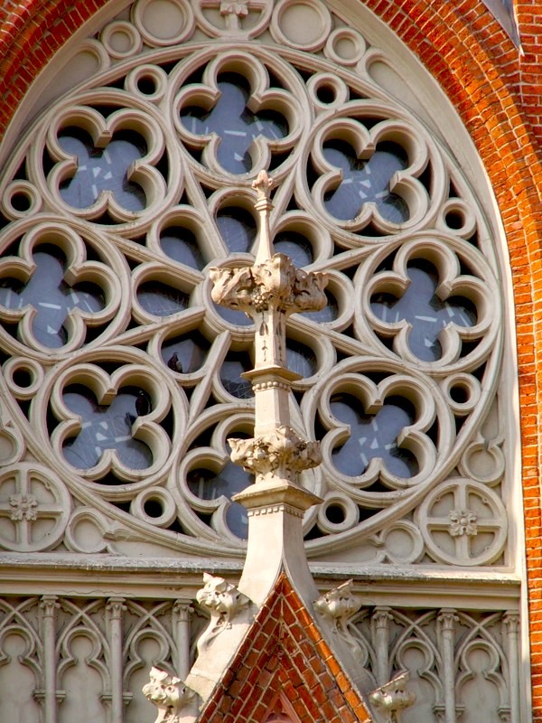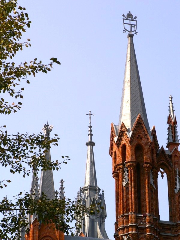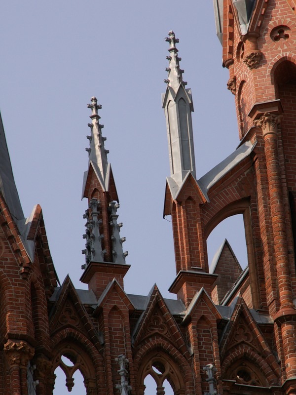 На шпиле центральной башенки установлен крест, на шпилях боковых башенок — гербы папы Иоанна Павла II и архиепископа Тадеуша Кондрусевича.