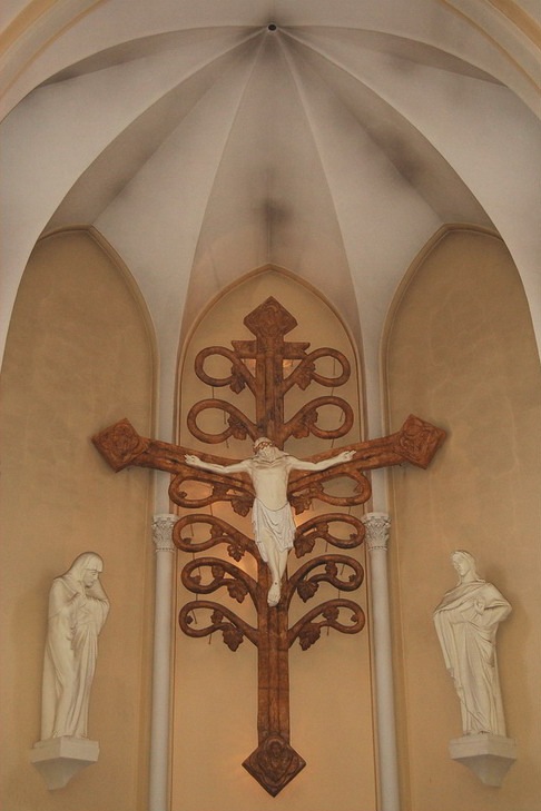 Стрельчатые оконные проёмы украшены витражами. Под оконными проёмами, на внутренних поверхностях стен, находятся 14 барельефов — 14 «стояний» Крестного пути.