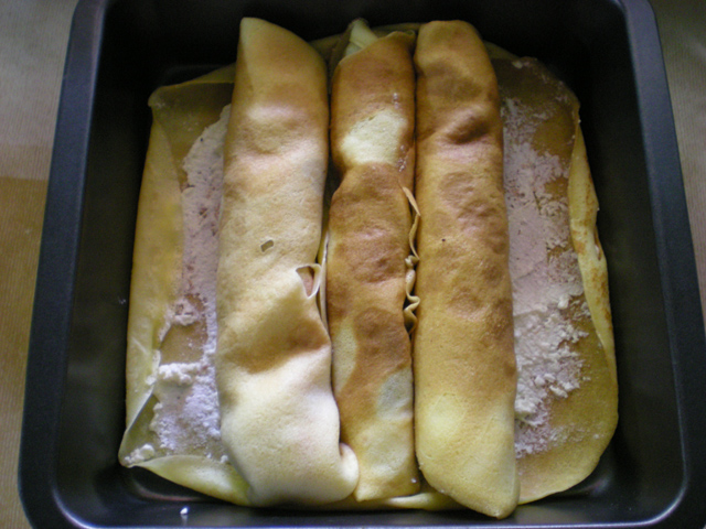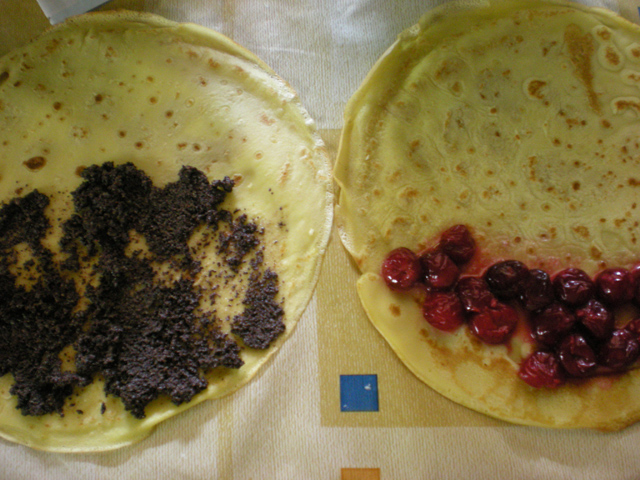 [показать] Теперь займемся сборкой нашей запеканки. Три блина нужно смазать маковой начинкой. На три блина уложить вишню. Начинку распределите до половины блина. Чтобы удобнее было сворачивать блины. Теперь сверните блины в трубочку.