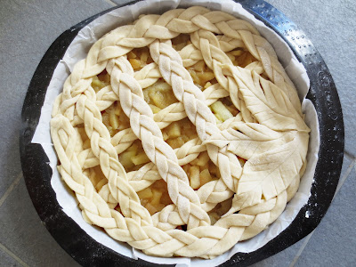 7.Готовые косички выкладываем на начинку и по кругу. Смазываем поверхность взбитым желтком. Оставляем на 20 минут.