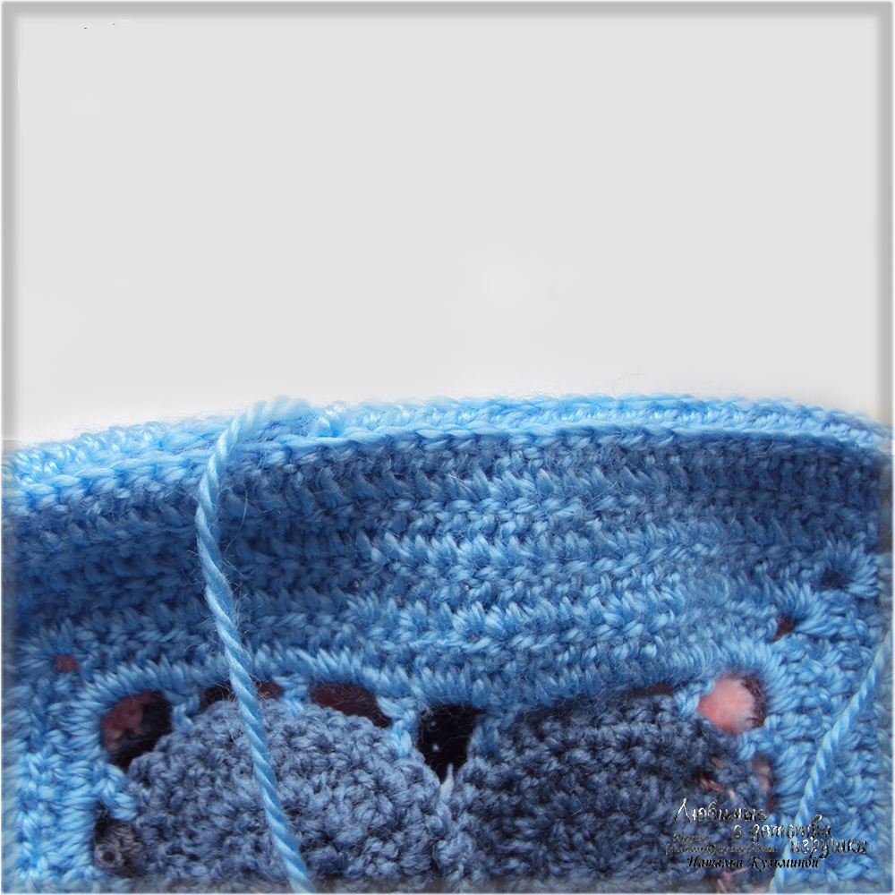 2-й ряд: Переходим на нить серого цвета и обвязываем ушко столбиками без накида. 4 столбика без накида в каждую петлю, 5 раз по 2 столбика без накида в каждую петлю, 4 столбика без накида.