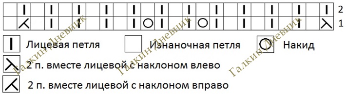 Небольшое пояснение к узору. Каждый лицевой ряд начинайте с 2 п. вместе. Далее - по рисунку до центральных 3-х петель, делаете накид, затем 3 п. по рисунку, накид, по рисунку до последних 3-х петель, 2 п. вместе, 1 изнаночная.