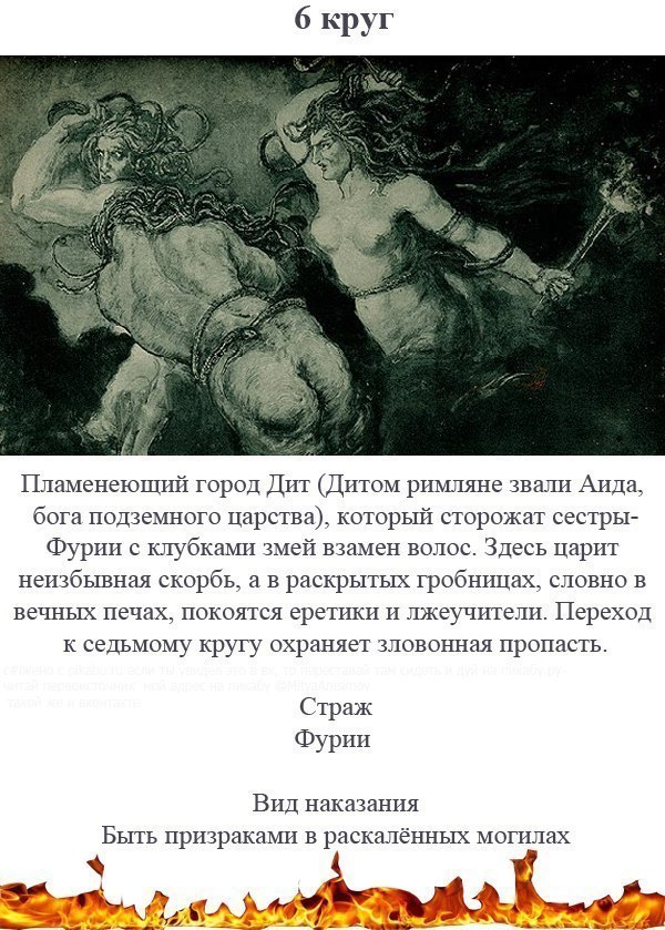 Шестой круг — это Стены города Дита, охраняемого фуриями — сварливыми, жестокими и очень злыми женщинами. Глумятся они над еретиками и лжеучителями, наказание которым — вечное существование в виде призраков в раскалённых могилах.