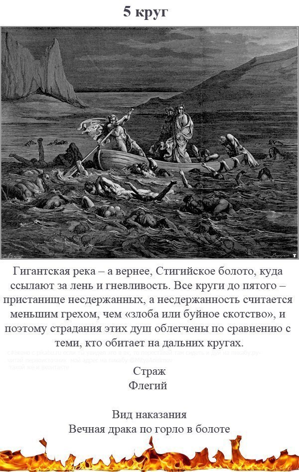 Пятый круг представляет мрачное и угрюмое место, охраняемое сыном бога войны Ареса — Флегием. Чтобы попасть на пятый круг ада, нужно быть очень гневным, ленивым или унылым. Тогда наказанием будет вечная драка на болоте Стикс.