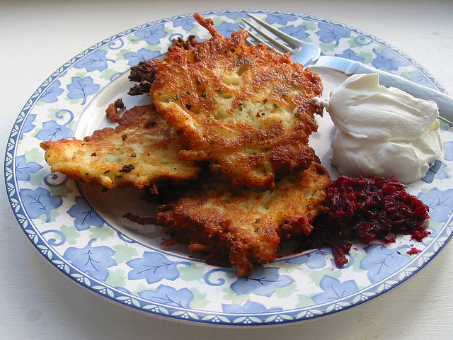 Как приготовить латкес. Картофель потереть на крупной терке, то же проделать с луком, смешать их с яйцом, затем добавить муку, подсолить и поперчить, всыпать щепотку зиры, снова перемешать. Выкладывать массу ложкой на сковороду с раскаленным маслом и жарить с двух сторон до зарумянивания. Подавать латкес горячими со сметаной.