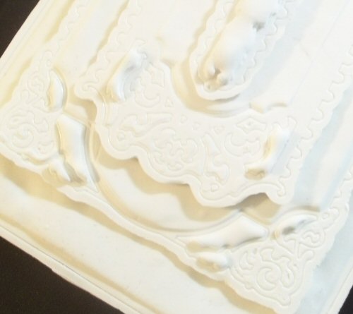 Dust the die templates with flour or talc, then place face down onto clay. Push each die template into clay until you get a deep impression. Remove wax paper.