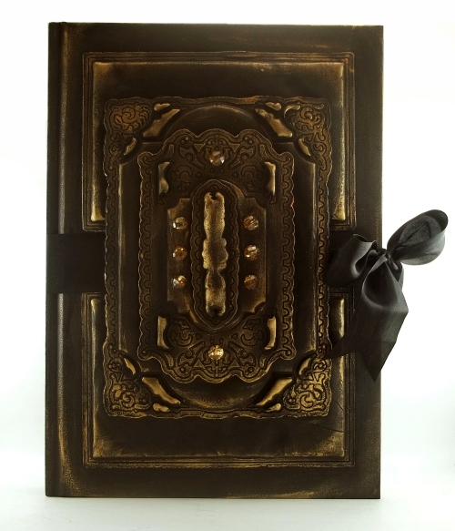Add rhinestones and silk ribbon to book and if desired, rub gold paste on page edges. Allow to dry thoroughly.