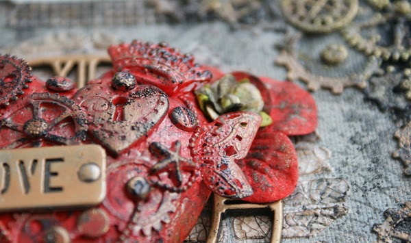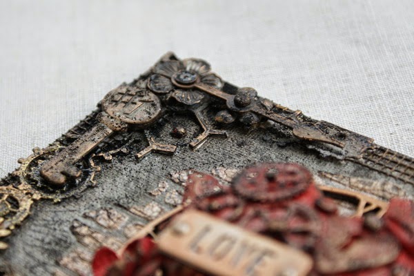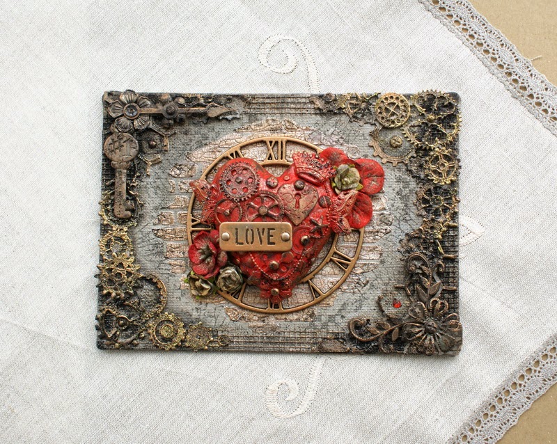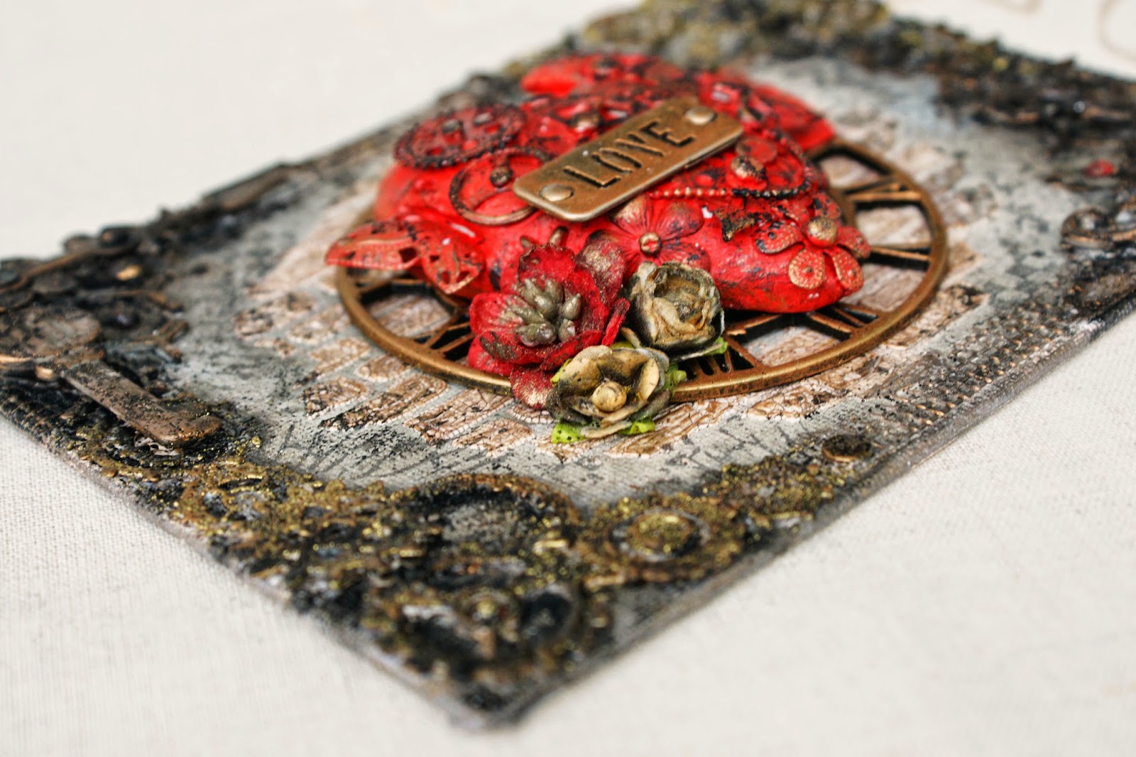 Крепим главный декоративный элемент в центр холста, который нужно обязательно прочно закрепить, так как сердце довольно тяжелое). Детально рассмотреть декор самого сердца можно по фото ниже. Там ничего особенного - покрыла красным акрилом, создала эффект потертости с помощью черного акрила, эмбоссинга и металлического воска.