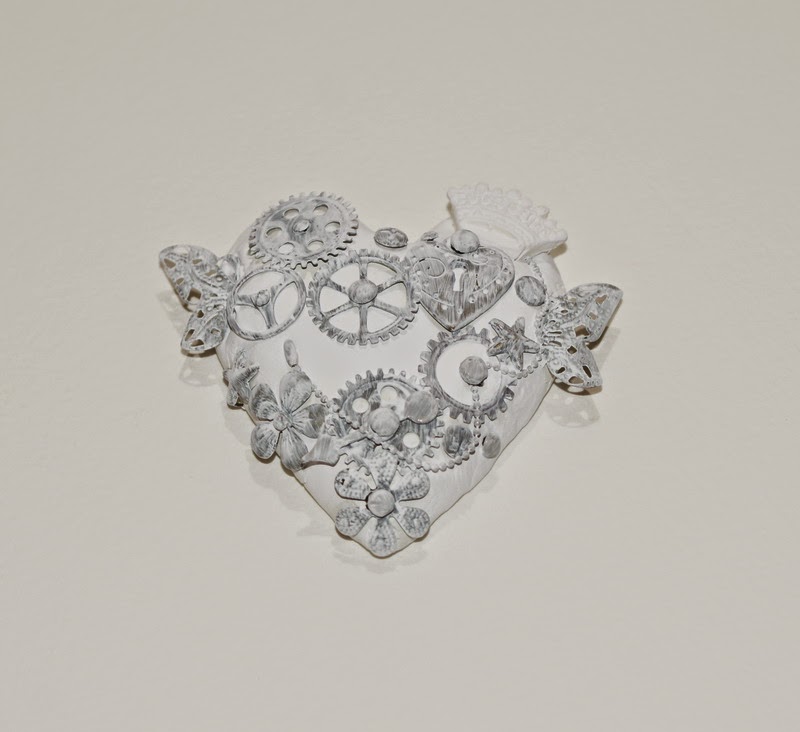 Сердце сделала заранее из самоотвердевающей глины и пока она не высохла прикрепила металлические детали, немного вдавливая. Когда сердце полностью застыло (на следующий день), покрыла грунтом.