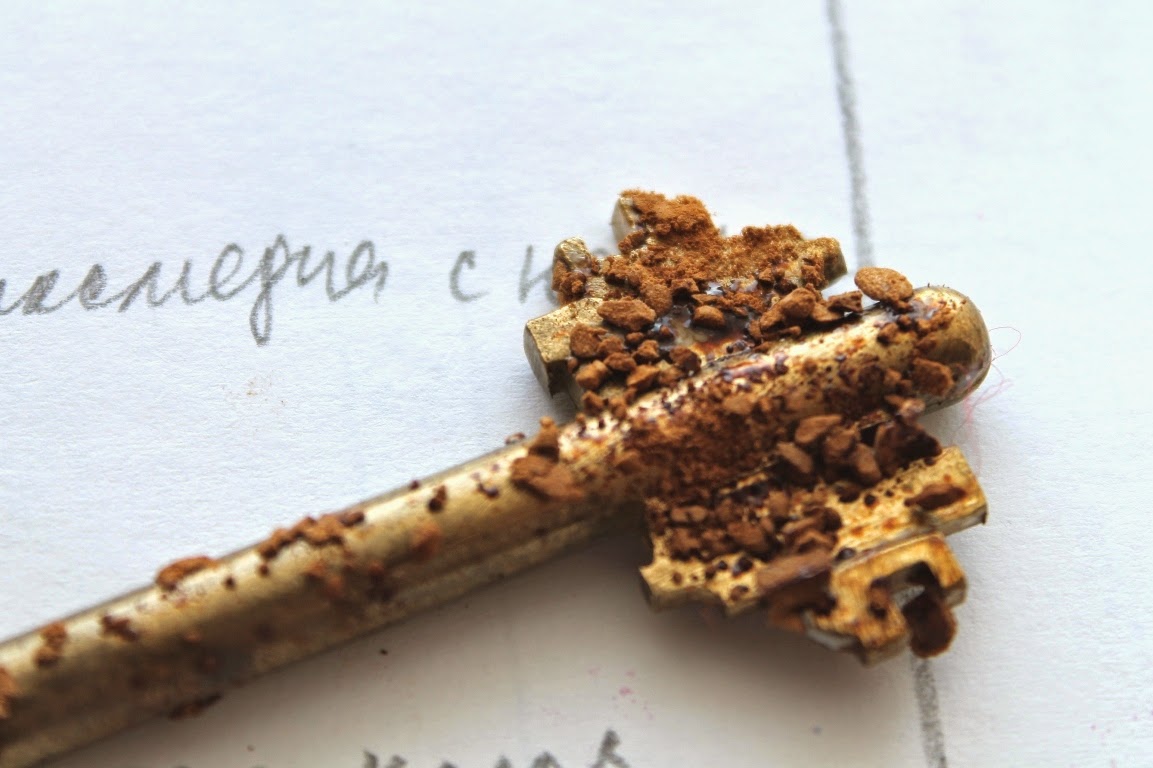 Тут все элементарно: намазываю декупажный клей (довольно густо) на ключ (я состаривала его только с 1 стороны), насыпаю на него сразу же, пока клей не высох, кофе. Кофе у нас снова растворимый и небрежно измельченный - тут есть и частицы совсем мелкие, и покрупнее. Жду, когда все подсохнет, затем постукиваю ключом по столу, стряхивая лишнее и нагреваю феном.