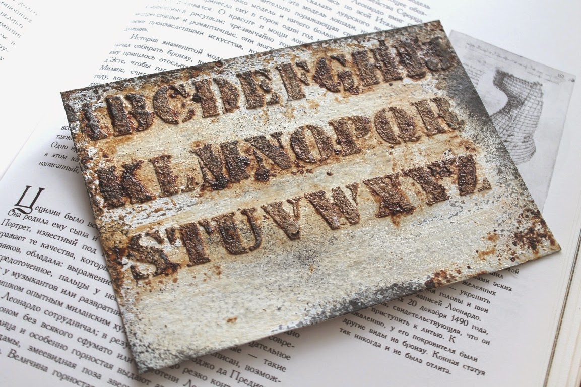 Беру трафарет с алфавитом и наношу полученную пасту на фон с помощью мастихина.