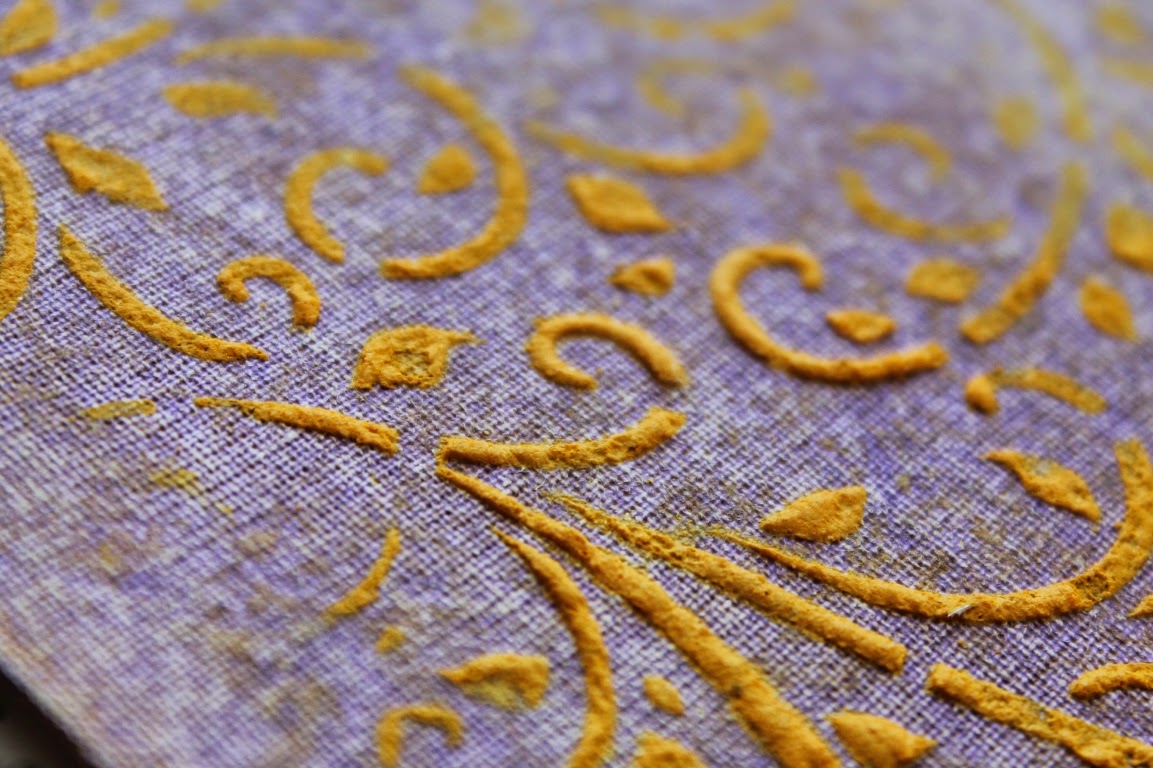Смешиваю (в пластиковой крышке) желтую акриловую краску и соду. Пропорции произвольные. Грунт я НЕ добавляю - интересно же посмотреть, как изменятся свойства. наношу полученню смесь мастихином через трафарет на фон. После высыхания нагреваю некоторые (не все!) участки рисунка феном для эмбоссинга - они становятся хорошо выпуклыми, объемными - эффект набивного рисунка налицо!
