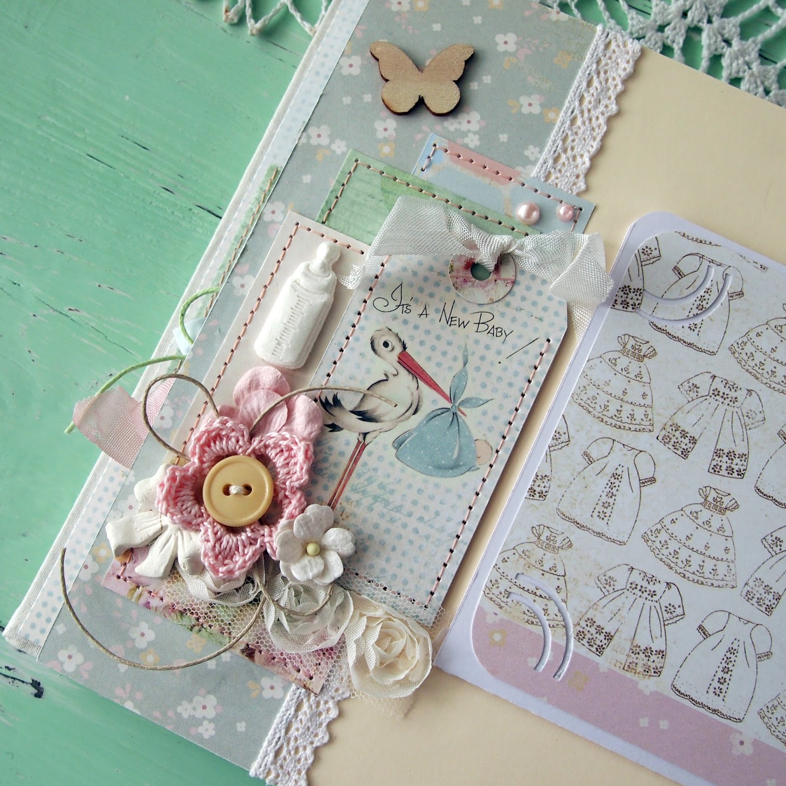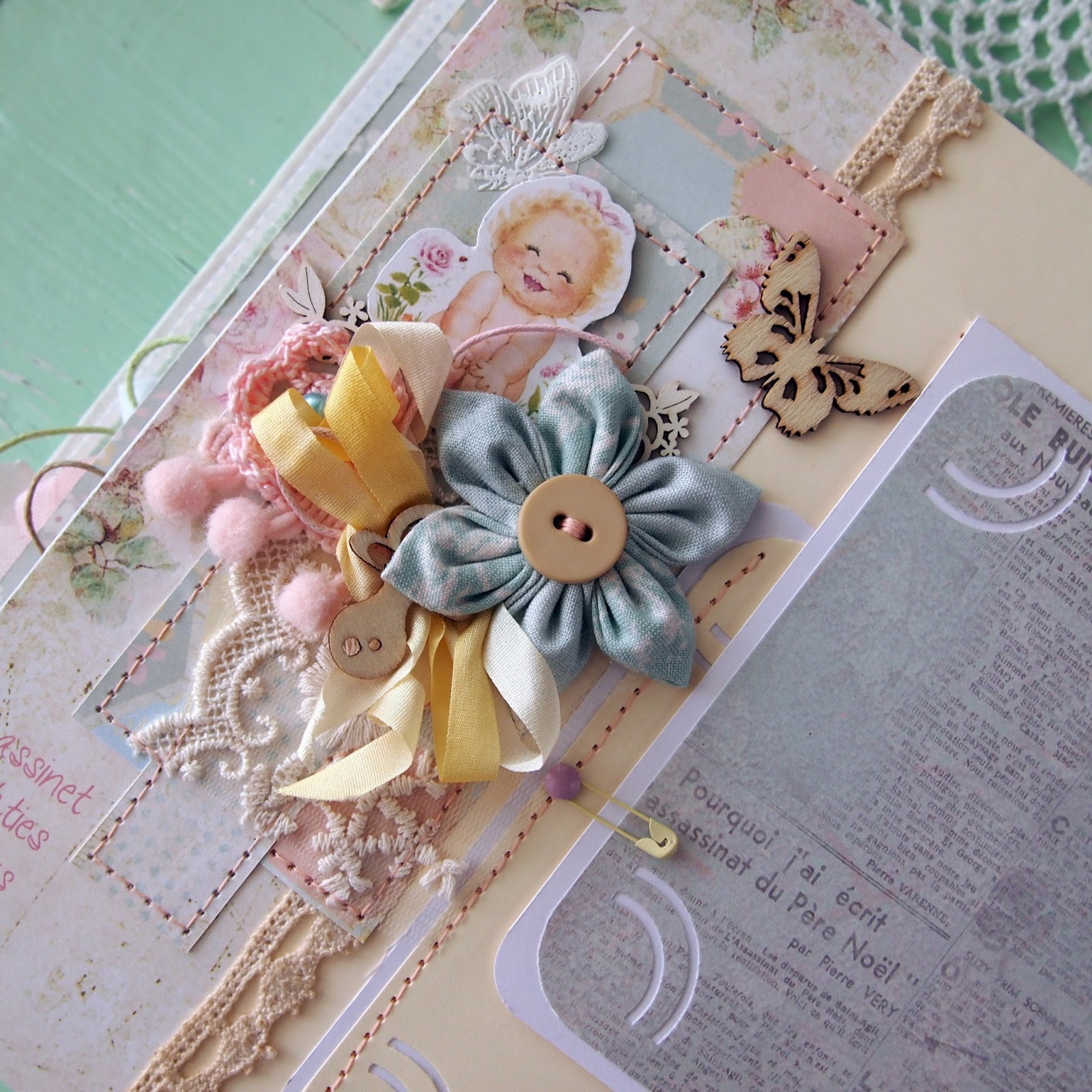 Чтобы поддержать и дополнить всю нежность и уютность этой бумаги , я использовала очень много украшений, созданных своими руками. Это рюши из фатина, вязаные цветы, пинетки, обвязанные картинки (вырезанные из листов бумаги), обтянутые тканью пуговки, кисточки из ниток, тканевые цветы и т.д.